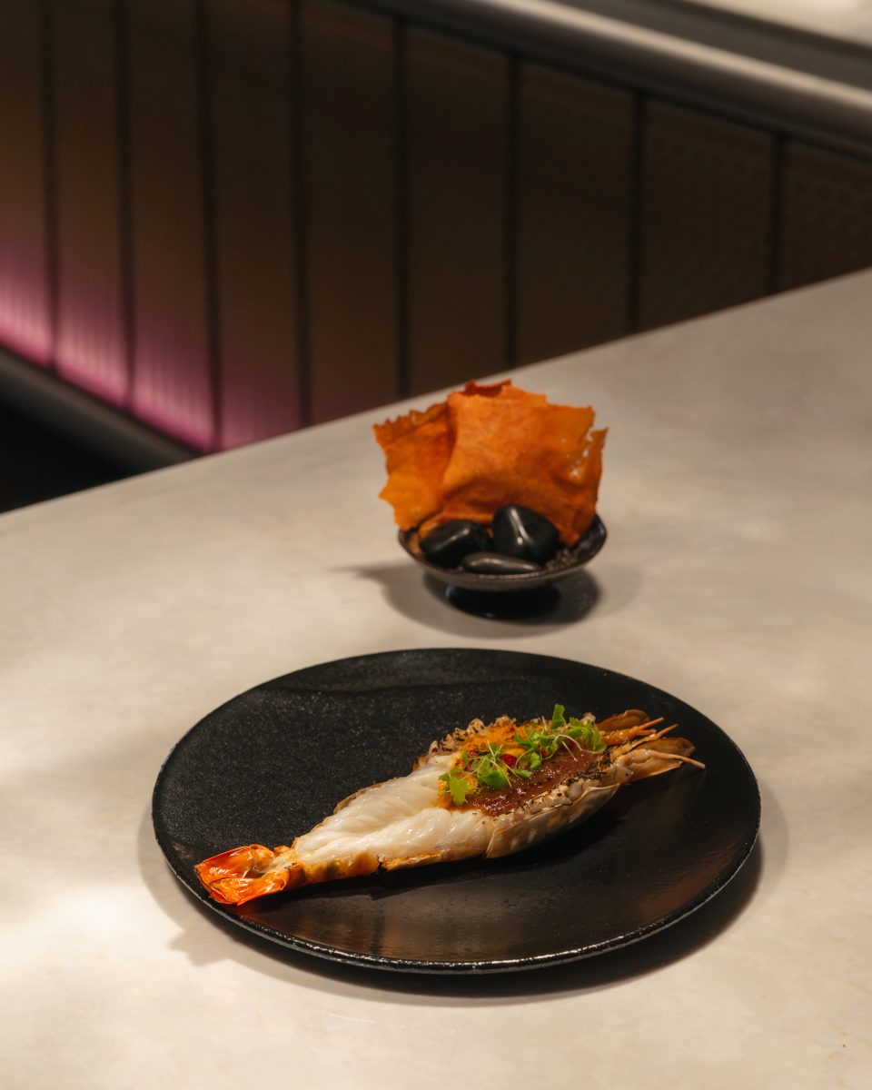 อีกหนึ่งเมนูที่ไม่ควรพลาดคือ กุ้งแม่น้ำย่าง กุ้งแม่น้ำจากจังหวัดสุราษฎร์ธานี ผ่าครึ่งย่างจนให้รสหวานฉ่ำตามธรรมชาติ เสิร์ฟคู่กับน้ำจิ้มมะขามพริกรสเปรี้ยวกลมกล่อม และซอสมันกุ้งแบบเข้มข้น