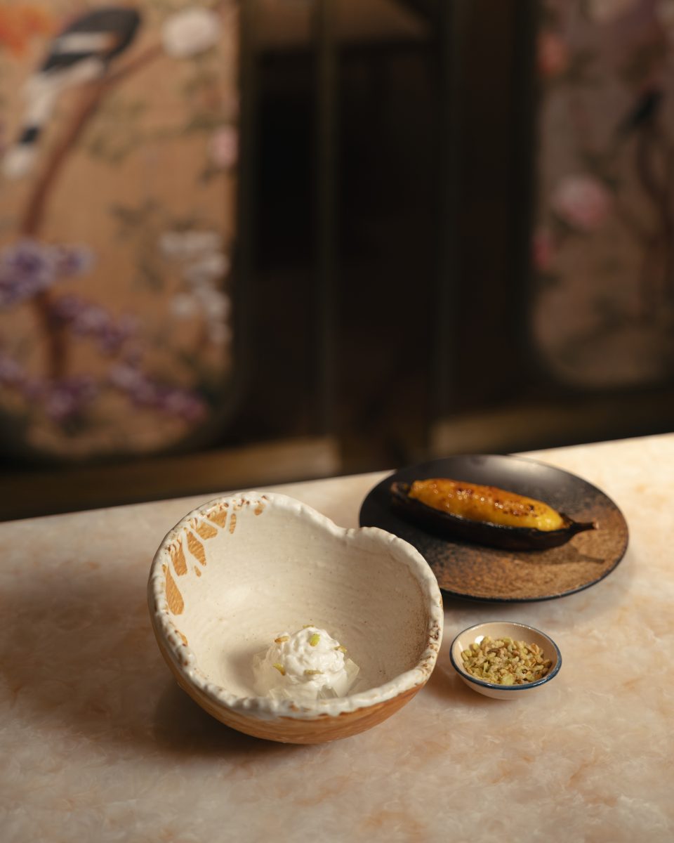มื้อค่ำโดยเชฟป้อม ณ บ้านพระยา เริ่มต้นที่ชานของบ้าน โดยแขกจะได้รับการต้อนรับด้วย ม้าฮ่อ และ ขนมดอกจอก ม้าฮ่อผสานความเปรี้ยวของสับปะรดที่เชฟตีความออกมาเป็นแผ่นบางๆ เข้ากับไช้โป๊วหวานและถั่วลิสงคั่วเสิฟในหนึ่งคำ ส่วนขนมดอกจอกหอมด้วยกลิ่นจากส้มซ่า จับคู่กับมะขามและพริกเพื่อเพิ่มมิติของความกลมกล่อม หลังจากนั้น ใบเครือหมาน้อยสาหร่ายพวงองุ่น ของว่างชิ้นล้างปากเล็กๆ เสิร์ฟคู่กับคอมบูชาในโซนครัวเปิด ก่อนที่แขกจะถูกเชิญเข้าสู่ที่นั่งเพื่อเริ่มต้นมื้อค่ำ