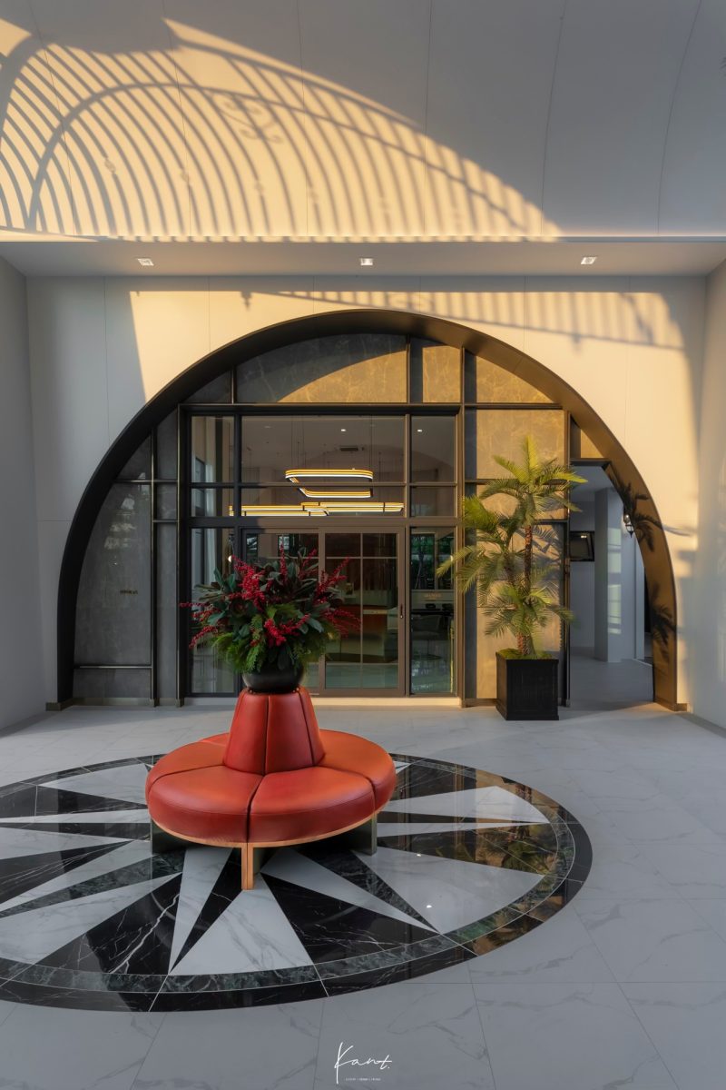 ด้านในแบ่งออกเป็น 2 ฝั่งพื้นที่ชั้นล่างด้านขวาออกแบบเป็น Lobby Lounge ภายในจัดวางชุดโซฟาดีไซน์หลากหลายเพื่อให้เกิดความรู้สึกผ่อนคลาย สบายๆ ระหว่างนั่งพัก และยังจัดให้มีมุมแบบส่วนตัวที่กระจายออกไปทั่วบริเวณ บรรยากาศค่อนข้างโปร่งด้วยผนังกระจกสูงจากพื้นจรดฝ้าเพดาน กรุขอบด้วยสีดำทำให้ตัดกับผนังสีขาวได้อย่างลงตัว