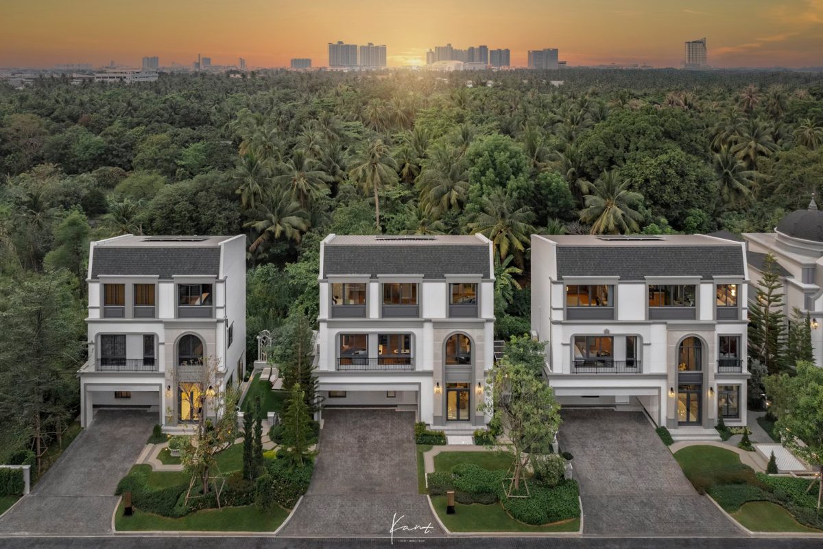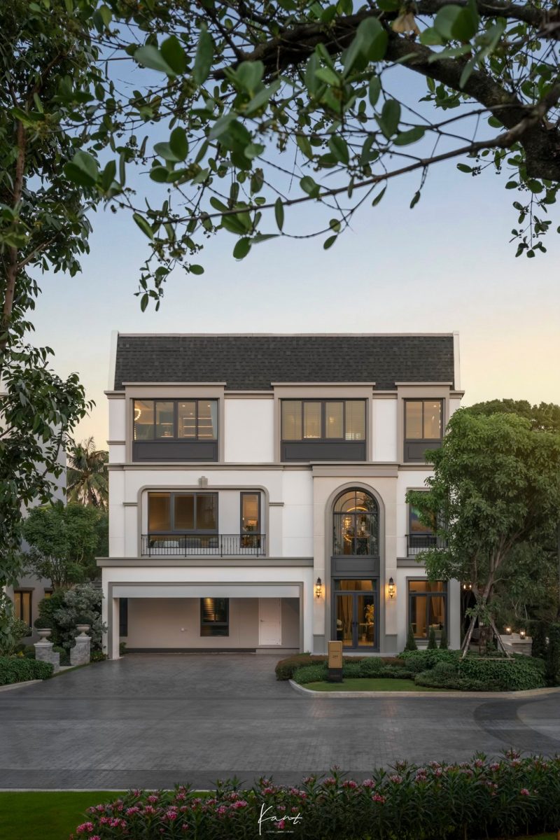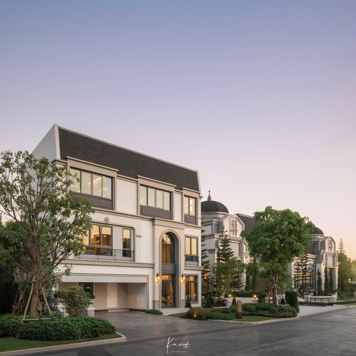 บ้านซีรี่ส์ใหม่ 3 ชั้นสุดหรูสไตล์ยุโรป ได้รับแรงบันดาลใจจากการนำเอกลักษณ์ของคฤหาสน์ยุโรปเข้ามาใช้ในการออกแบบ ลดทอนงานตกแต่งให้ดูเรียบขึ้นแต่ดูทันสมัย ทำให้โครงการนี้มีกลิ่นอายสถาปัตยกรรมยุโรปผสมผสานอยู่อย่างลงตัว เป็นดีไซน์ในแบบที่กานต์ชอบมาก คือมีประตูโค้งทรง Arch รับกับเส้นสายเหลี่ยมมุมที่คมจัด เน้นการใช้สีบ้านเป็นสีสว่าง ตัดกับเฟรมประตูและหน้าต่างที่มีสีเข้ม เพื่อสื่อให้เห็นถึงความเรียบหรูดูคลาสสิคของตัวบ้านที่ดูทันสมัยและอบอุ่น ราวกับพักอยู่ในย่านเลอมาเร่ส์ (Le Marais) ของปารีส