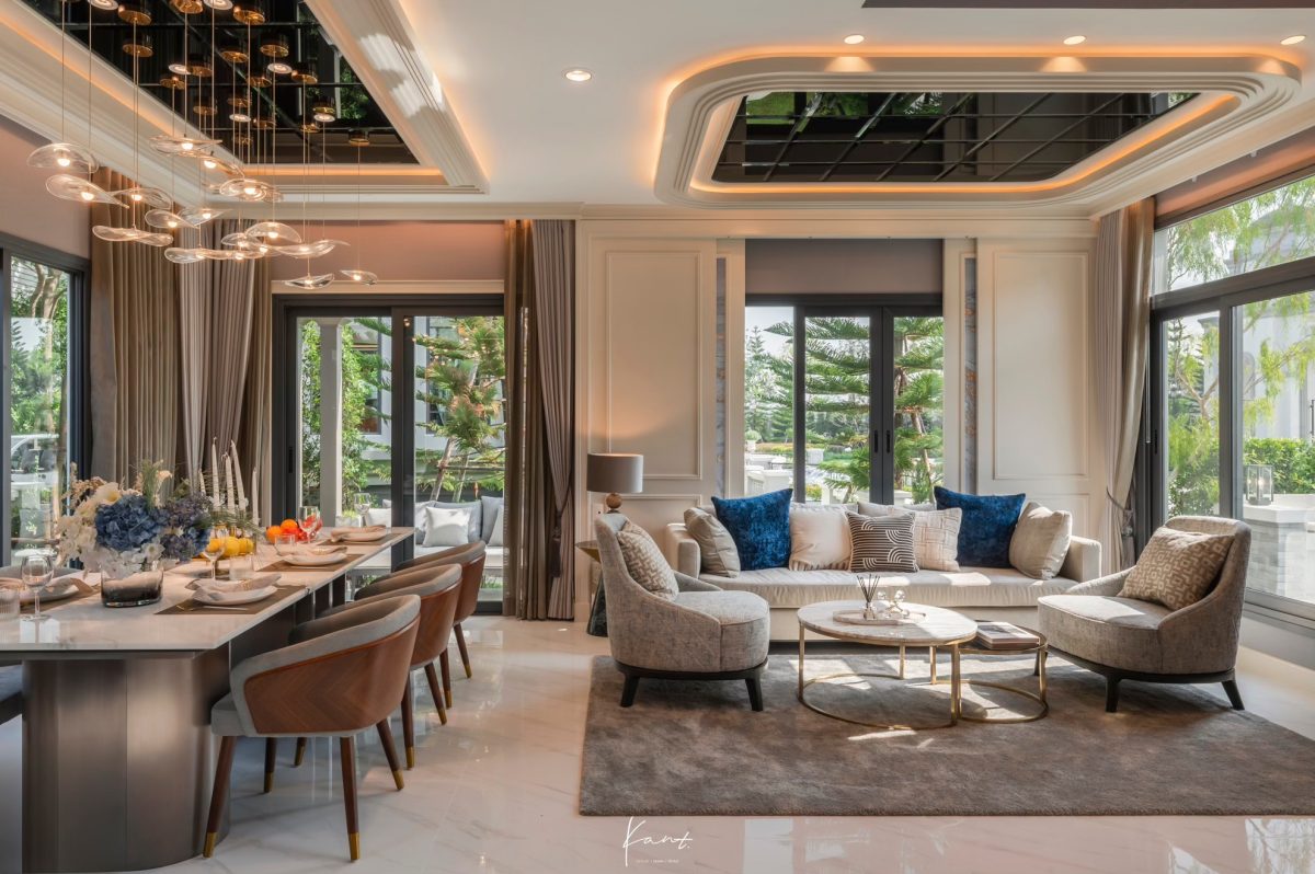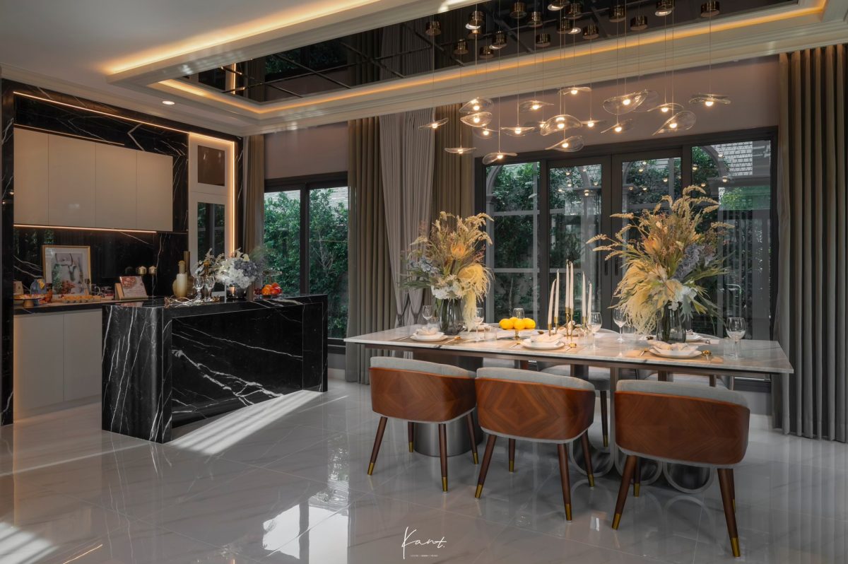 เมื่อเข้ามาด้านใน เราจะพบกับการออกแบบที่คำนึงถึงความเป็นส่วนตัว เน้นพื้นที่ใช้สอยและฟังก์ชันที่ตอบโจทย์ทุกคนภายในบ้านได้ดีโดยมีไฮไลท์คือ Common Area กลางบ้าน ซึ่งออกแบบให้ Living & Dining Area เชื่อมต่อกัน จัดงานเลี้ยงได้สบายเลยครับ สามารถใช้พื้นที่ทั้งหมดได้ในคราวเดียว