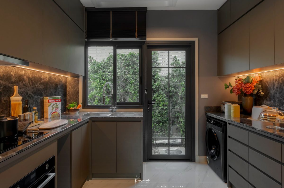 ถัดเข้าไปด้านในเป็นครัวไทยแบบปิด ป้องกันกลิ่นย้อนกลับเข้ามาภายในบ้านและทำให้สะดวกยิ่งขึ้นในการจัดเตรียมและเสิร์ฟอาหาร โครงการจัดวางเคาน์เตอร์โดยรอบห้องครัวโดยเว้นพื้นที่ช่วงประตูเอาไว้มีเคาน์เตอร์ครัวท็อปหินแกรนิตสีดำ พร้อม Sink และ Hood มาให้ตามบ้านมาตรฐาน อีกทั้งยังให้ความเป็นส่วนตัวเพราะเชื่อมต่อกับพื้นที่ Back of House ทางเข้าออกของแม่บ้านด้านหลังบ้านจะเป็นลานซักล้าง ที่มีการเตรียมงานระบบน้ำ-ไฟให้เรียบร้อย พร้อมทั้งติดตั้งปั๊มน้ำและถังสำรองน้ำบนดินมาให้แล้วครับ ติดกันจะเป…