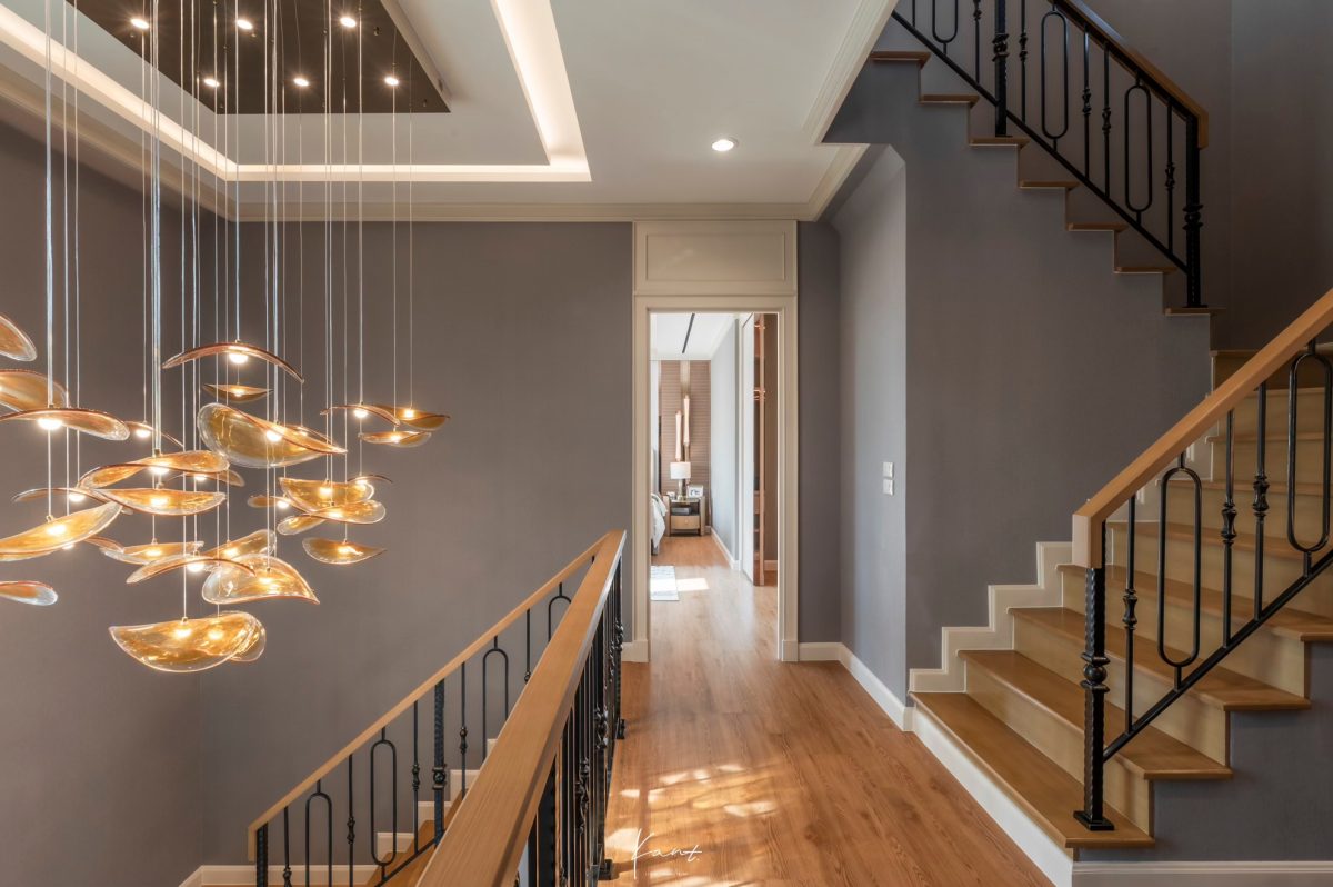 เราเดินขึ้นบันไดไปชมชั้นสองของบ้านกันต่อครับ บันไดออกแบบให้อยู่ช่วงกึ่งกลางของบ้าน โครงสร้างบันไดเป็นคอนกรีตเสริมเหล็ก ปิดผิวลูกตั้งลูกตั้งลูกนอนเป็นลายไม้สีน้ำตาลเข้ม ราวกันตกเป็นเหล็กดัดทาสีดำ ส่วนมือจับเป็นลายไม้เข้ากันดี บริเวณชานพักเป็นพื้นที่รูปทรงสี่เหลี่ยมที่มีขนาดค่อนข้างกว้าง ระหว่างชานพักมีหน้าต่างเปิดช่องแสงจากธรรมชาติเพื่อช่วยส่องสว่างบริเวณบันได ประดับด้วยแชนเดอร์เลียบนฝ้าที่สูงแบบ Double Volume ทำให้บ้านดูสูงโปร่ง เชื่อมฟังก์ชันการใช้งานด้วยระเบียงชั้น 2 ที่มอง…