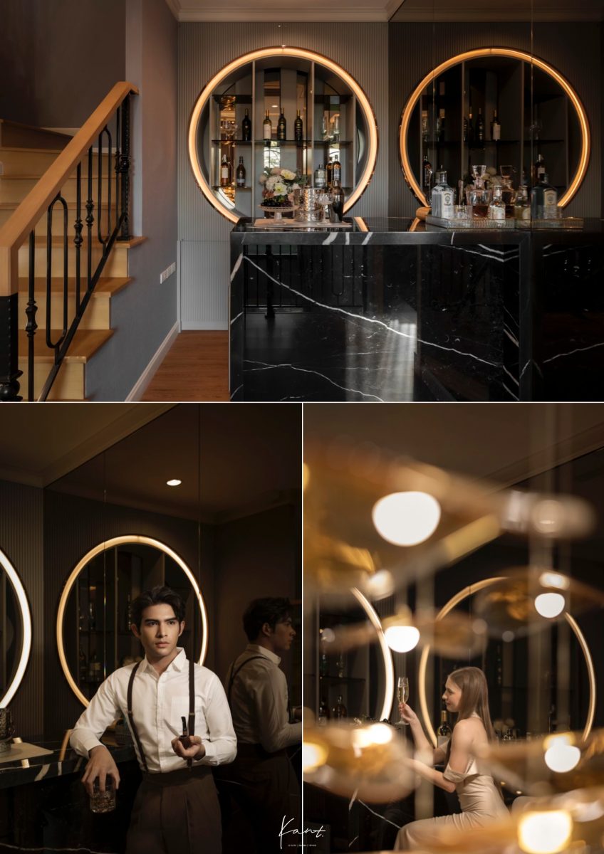 โถงกลางบ้านมาพร้อมกับมุม Bar ซึ่งอยากบอกว่าฟีลดีมาก ออกแบบให้มีกลิ่นอายของเฮ้าส์คลับในยุโรป สำหรับนั่งดื่มเบาๆ ในบรรยากาศสบาย ๆ กับคนในครอบครัว หรือจัดเลี้ยงในวันพิเศษของครอบครัวและเพื่อนสนิท…