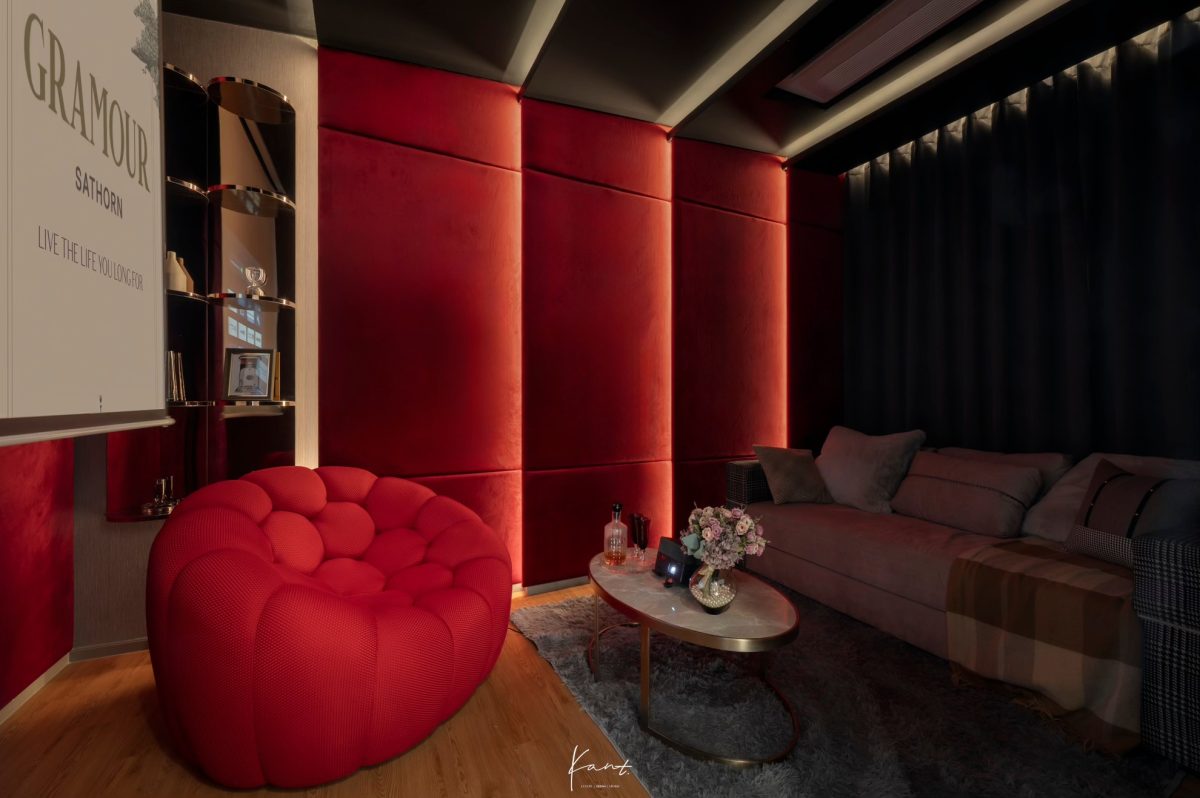 ติดกันเป็นห้องนอนตามบ้านมาตรฐาน แต่บ้านตัวอย่างดีไซน์เป็นไอเดียที่เอาใจคุณผู้ชายด้วยการออกแบบให้เป็น Entartainment Room ห้องดูหนังสุดหรูแบบส่วนตัวภายในบ้าน ตกแต่งด้วยสีแดงบุกำมะหยี่เอาไว้เป็นห้องสำหรับนอนดูซีรีย์เรื่องโปรดพร้อมหน้าพร้อมตากันทั้งครอบครัวเลยครับ อยากจะจิบเครื่องดื่มก็สามารถออกไปที่บาร์ด้านนอกได้เลยแล้วมาเอนจอยต่อกันด้านใน ถือเป็นจุดที่ดีมากเพราะว่่าสถาปนิกออกแบบมาเผื่อไว้สำหรับให้เราปรับเปลี่ยนฟังก์ชันการใช้งานแต่ละห้องให้ตรงตามไลฟ์สไตล์ ความต้องการและความจำเป็…
