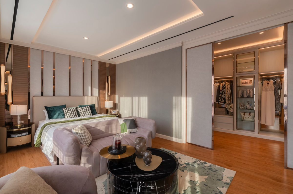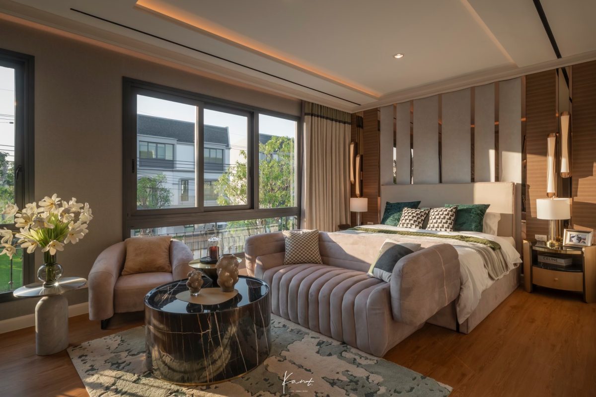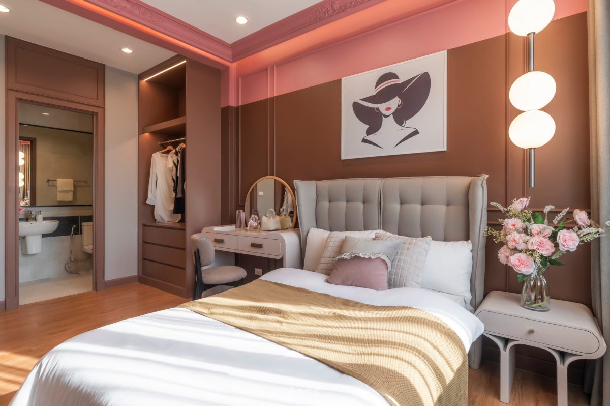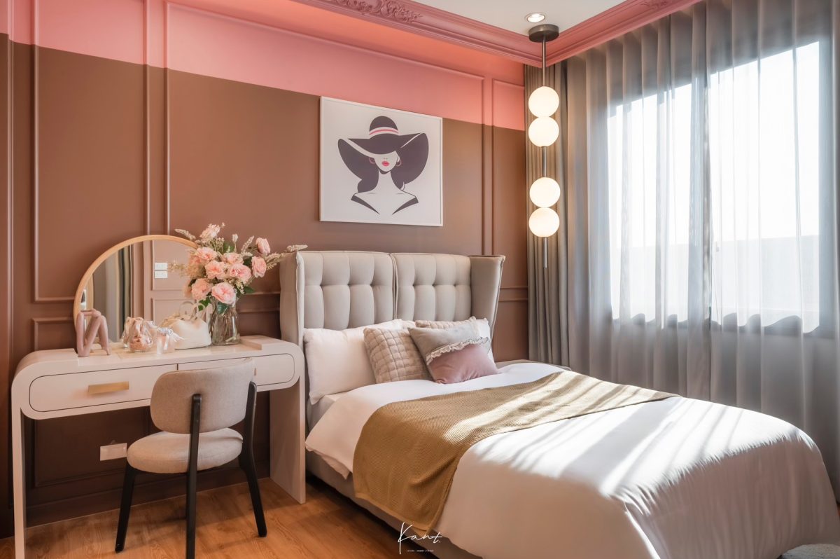 บ้านตัวอย่างออกแบบจัดวางฟังก์ชันภายในได้ค่อนข้างลงตัว จัดวางเตียงนอนไว้ด้านในสุดริมหน้าต่างเปิดช่องแสงเข้ามาภายใน มีพื้นที่ว่างเดินได้รอบเตียง พร้อมโต๊ะหัวเตียงดีไซน์วินเทจ หัวเตียงบุนวมพร้อมปีกซ้ายขวาให้ความรู้สึกหรูหรา โคมไฟห้อยลงมาจากเพดานส่องสว่างตอนก่อนนอน ผนังหัวนอนกรุด้วยคิ้วบัวสไตล์ยุโรป ส่วนตัวชอบการเลือกใช้โทนสีที่ดูมีเสน่ห์และไม่ค่อยพบเห็นจากโครงการไหนมากนักคือเป็นโทนชมพู เทาเป็นหลักดูมีความยูนีคเป็นตัวของตัวเองสูงตามสไตล์ห้องนอนคนรุ่นใหม่…
