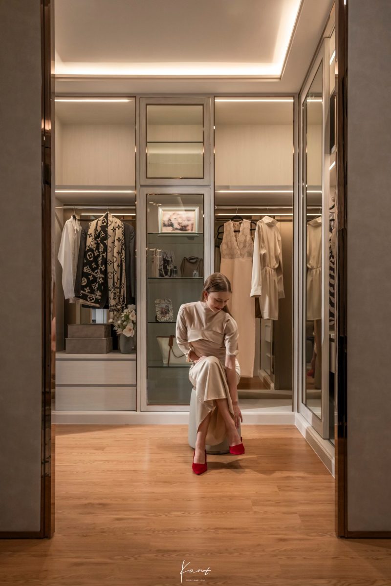 ด้านในเป็นพื้นที่ของห้องน้ำ ส่วนห้องแต่งตัวจะอยู่เชื่อมต่อกันเป็นแบบ Walk-in Closet ติดตั้งตู้เสื้อผ้าขนาดใหญ่ไว้สูงจากพื้นจรดเพดานเอาไว้ ภายในออกแบบให้มีตู้และชั้นวางที่สามารถจัดเก็บเสื้อผ้า แอคเซสเซอรี่ กระเป๋าได้จุใจ ทำให้เราสามารถจัดเก็บเสื้อผ้าได้เยอะมากและแยกการใช้งานของคุณผู้ชายและคุณผู้หญิงได้อย่างเป็นสัดส่วน…