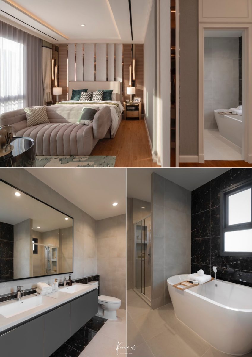 ติดกันเป็นโต๊ะเครื่องแป้งที่ตกแต่งในสไตล​์ยุโรปแบบย้อนยุค มีตู้เสื้อผ้าสูงจรดเพดานวางชิดติดกันอยู่หน้าห้องน้ำ ซึ่งอยู่ถัดเข้าไปด้านใน เป็นห้องน้ำที่ให้มาครบทั้งอ่างล้างหน้า สุขภัณฑ์และมุมฝักบัวอาบน้ำ สิ่งที่เราชอบคือการออกแบบตกแต่งภายในที่คำนึงถึงความโปร่งสบาย เวลาไปทำงานหรือเดินทางกลับจากต่างประเทศมาเหนื่อยๆ พอมาถึงบ้านแล้วรู้สึกสบายใจ ผ่อนคลายมากเลยครับ…