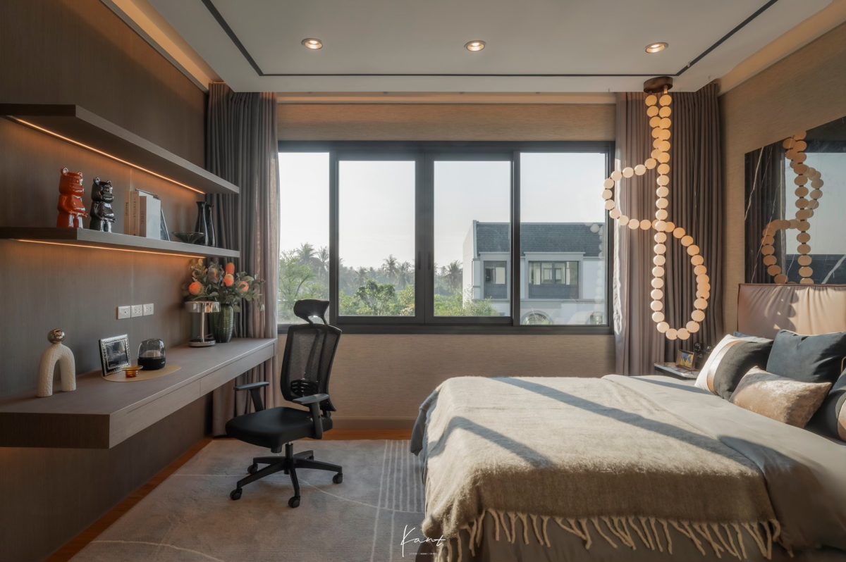 อย่างเช่นห้องนอน ที่อยู่ชั้น 3 ก็เช่นกัน ข้อดีก็คือเมื่อขึ้นไปชั้นสูงจะค่อนข้างเงียบทำให้ได้เปรียบเรื่องความสงบและความเป็นส่วนตัว ภายในห้องตกแต่งด้วยโทนสีน้ำตาล เทา ดำ ทำให้ดูเรียบง่ายให้อารมณ์พักผ่อน ภายในห้องนอนจัดวางฟังก์ชันได้อย่างเป็นสัดส่วน ค่อนข้างลงตัว…