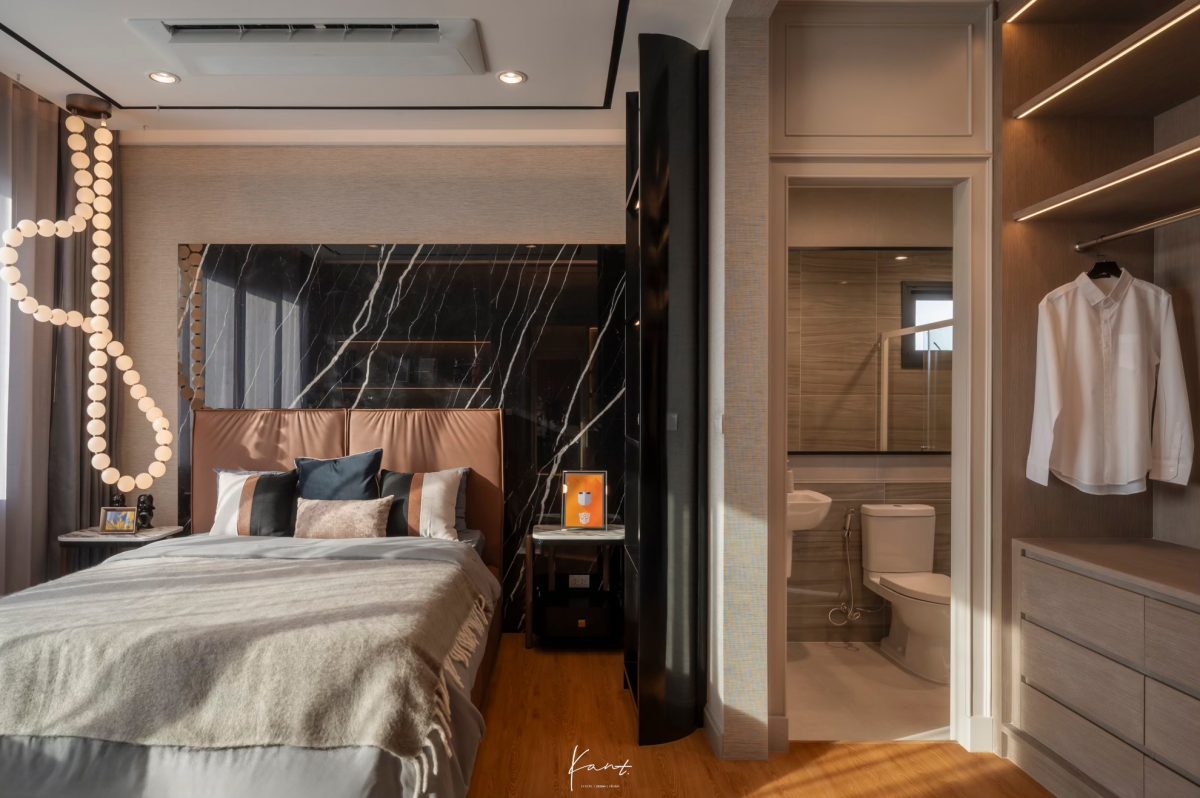 มุมแต่งตัวจะเชื่อมต่อกับห้องน้ำที่กานต์มองว่ามีขนาดค่อนข้างกว้างเป็นอีกหนึ่งจุดเด่นของบ้านหลังนี้ ที่อยากจะเน้นคือการให้ Space ขนาดใหญ่กับห้องน้ำภายในห้องนอนเพราะถือเป็นพื้นที่ส่วนตัว…