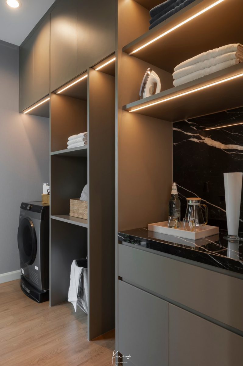ฝั่งตรงข้ามออกแบบให้มีเคาน์เตอร์เล็กๆ มีตู้ปิดสำหรับติดตั้งตู้เย็นเอาไว้จัดเก็บเครื่องดื่มซึ่งเราว่าเป็นไอเดียที่ดีมาก จะได้ไม่ต้องลงบันไดลงไปยังชั้นล่างในตอนกลางคืน อีกทั้งยังมีมุม Laundry ที่ยกขึ้นมาไว้ด้านบนอีกจุด สะดวกดีเหมือนกัน เพราะให้ฟีลเหมือนอยู่เพนท์เฮ้าส์ใจกลางปารีส…
