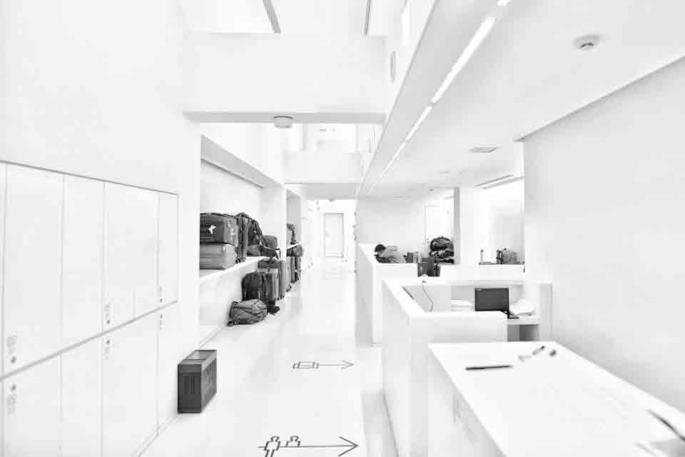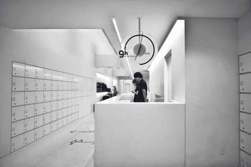 โรงแรม 9h จัดวางผังอาคารเป็นสี่เหลี่ยมผืนผ้า ยาวลึกเข้าไป แต่ความเก๋ไก๋เพิ่งเริ่มต้น ด้วยการดีไซน์พื้นที่เน้นสีขาวออกแนวล้ำหน้าอนาคตยังไงก็ไม่ทราบ การออกแบบจัดแบ่งพื้นที่ใช้สอยได้เยี่ยมมาก