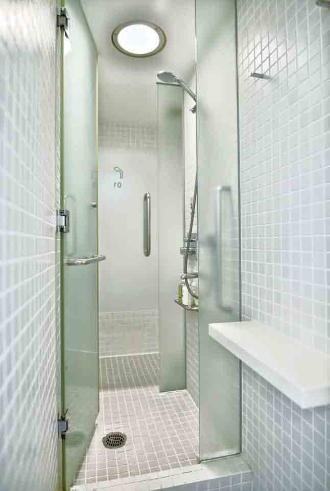 ห้องอาบน้ำรวมแยกห้องกันเป็นสัดส่วน จะมีส่วนแห้งส่วนเปียก แถมด้านหลังจะมีประตูกระจก [ฝ้า] ปิดไ้ว้ครึ่งตัว ก้มเก็บอะไรไม่ได้เลยนะ