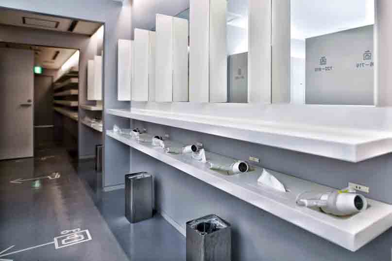 ส่วนของผู้ชายจะพักชั้น 6-7 ส่วนห้องอาบน้ำจะอยู่ชั้น 9 ต้องขึ้นลิฟต์ไปครับ และยังแบ่งโซนล้างหน้า แปรงฟัน มีบริการโต๊ะกระจก ไดร์เป่าผมให้ด้วย