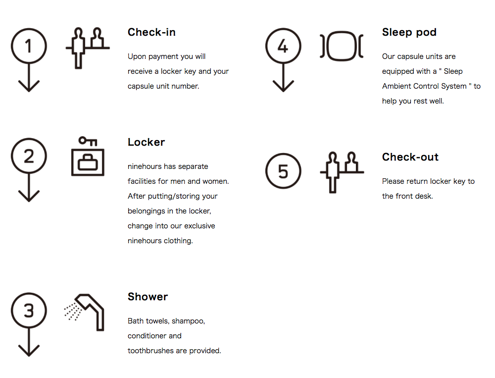 9h พยายามที่จะอำนวยความสะดวกทุกอย่าง สำหรับผู้ [ผ่าน] มาพัก เช่น มีล็อกเกอร์ให้สำหรับกระเป๋าใหญ่ มีบริเวณให้เล่นเน็ต ถ้าไม่ได้เอาแล็ปท็อปมาเอง ก็มีให้เช่า ล็อกเกอร์ของเราจะเป็นหมายเลขเดียวกับแคปซูลที่เรานอนครับ