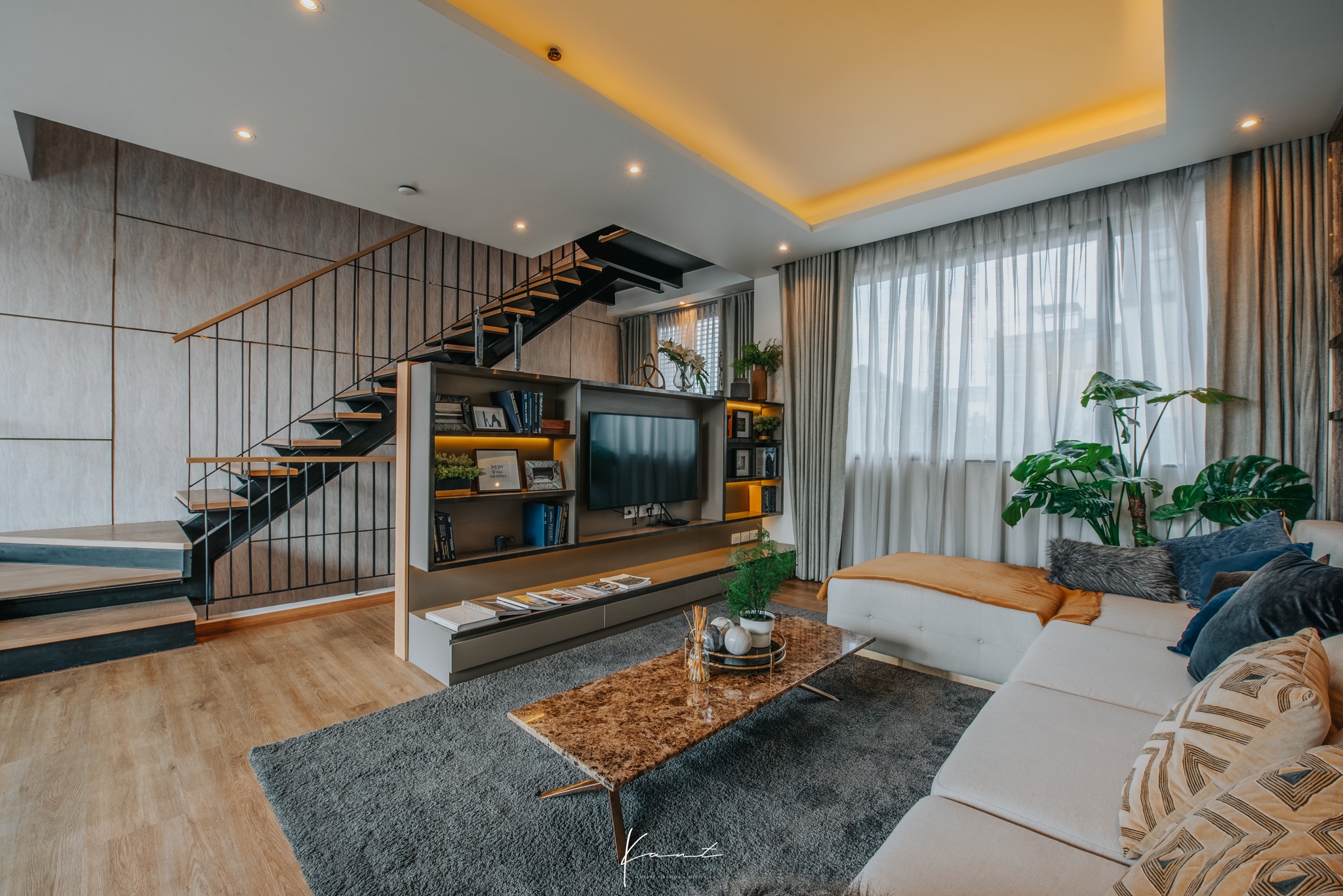 Living Area ออกแบบให้บริเวณชั้นล่างเชื่อมต่อกับชั้นลอย ถือเป็นพระเอกของบ้านเลยครับเพราะโดดเด่นด้วยโถงสูงแบบ Double Volume มองเห็นพื้นที่สวนด้านนอกผ่านกระจกสูงจากพื้นจรดเพดาน 6.3 เมตร เป็นกระจกนิรภัย Tempered Glass สีเขียวตัดแสง กันความร้อนและเก็บเสียงได้ดี ส่วนประตูบานเลื่อนเป็นแบบ 4 ตอนสามารถเลื่อนเปิดได้ด้านเดียว