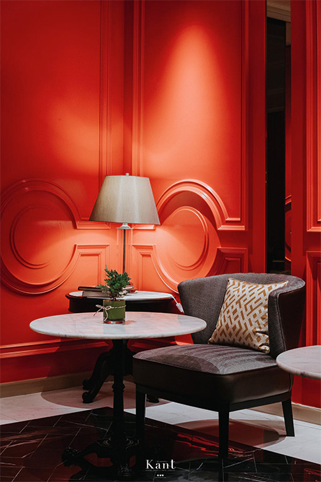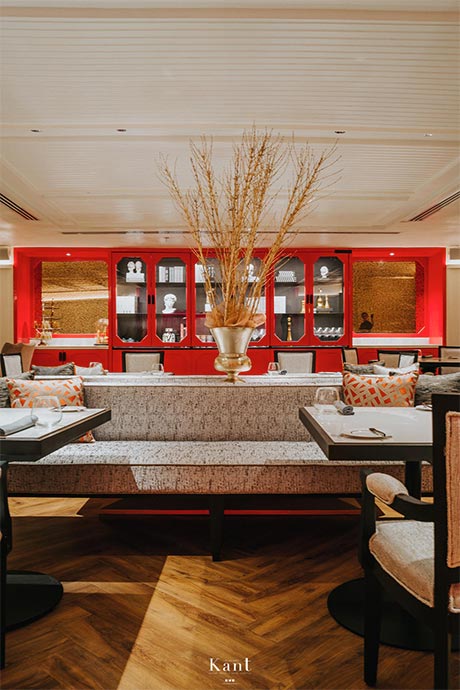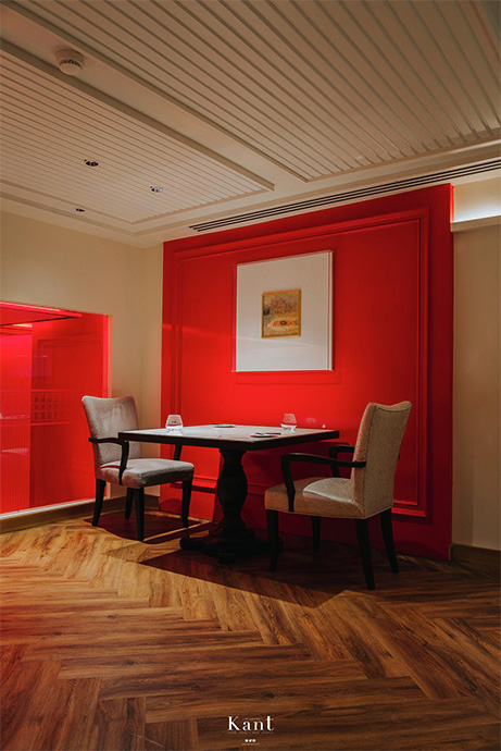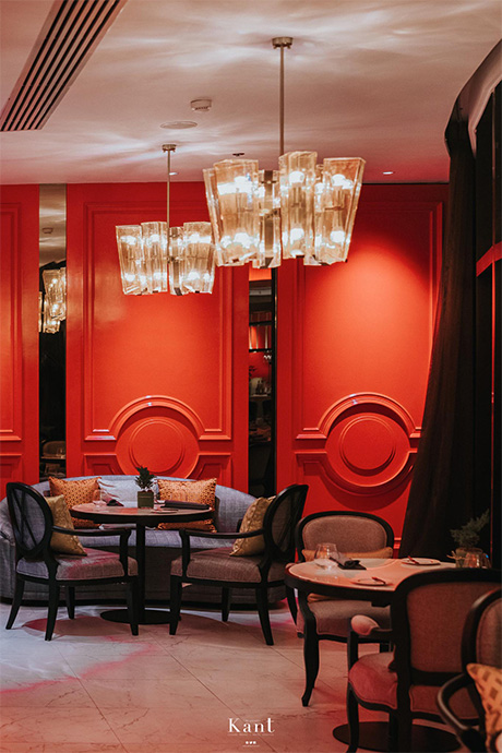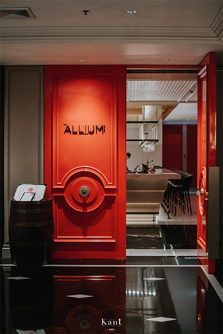 ทันทีที่ลิฟต์เปิดออก เราเดินมาทางขวาเล็กน้อยจะเห็นประตูสีแดงสดบานใหญ่พร้อมป้าย The Allium ดูสะดุดตาอยู่เบื้องหน้า มองเข้าไปด้านในเห็นการตกแต่งร้านที่ดูหรูหรา ร่วมสมัย มีสไตล์ยุค Art Deco ปนมานิดๆ มีงานศิลปะวางตกแต่งประดับประดาไปทั่ว ให้อารมณ์เหมือนทานอาหารบ้านเพื่อนที่มีรสนิยมในการใช้ชีวิตที่ดีงาม
