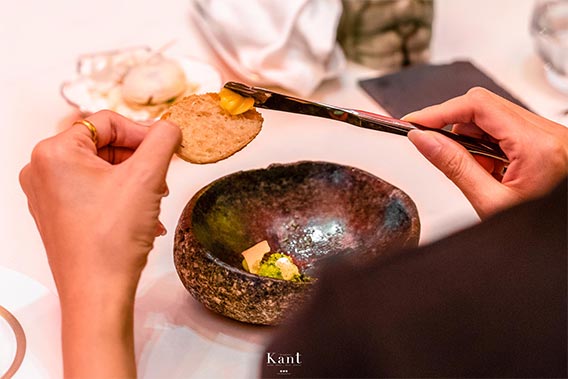 ตามธรรมเนียมของห้องอาหารฝรั่งเศส ที่ก่อนเริ่มต้นคอร์ส จะเสิร์ฟขนมปังโฮลวีตสไตล์ฝรั่งเศสผิวกรอบเนื้อเหนียวนุ่มหนึบหนับ ทานคู่กับเนยนำเข้าจากฝรั่งเศสหอมอร่อยมากครับ