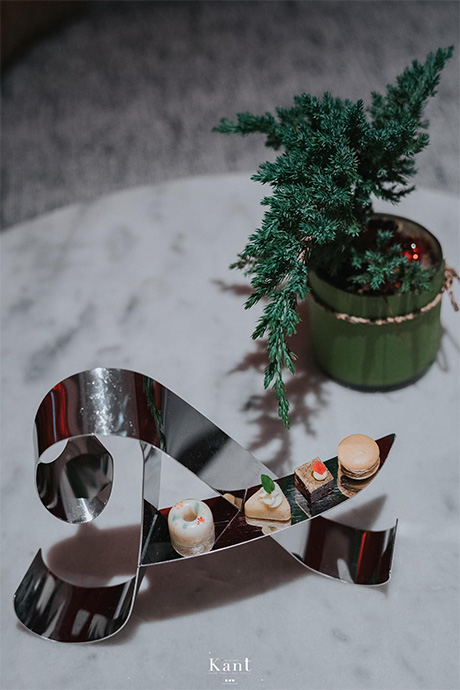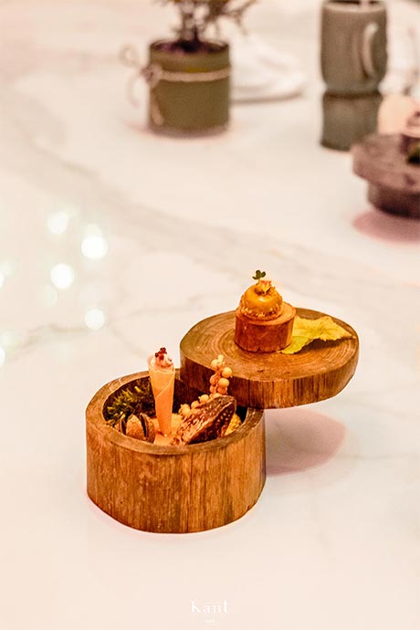 ปิดท้ายด้วย Petits Fours เป็นขนมหวานชิ้นเล็ก ๆ สี่ชิ้นสี่อย่าง เสิร์ฟมาในชั้นวางรูปตัวอักษร “A” ซึ่งก็น่าย่อจะมาจากคำว่า Allium นี่แหละ