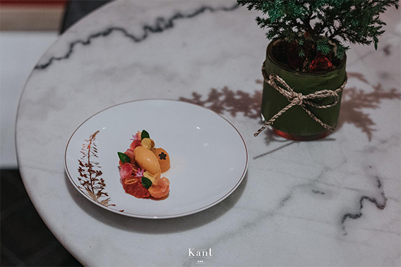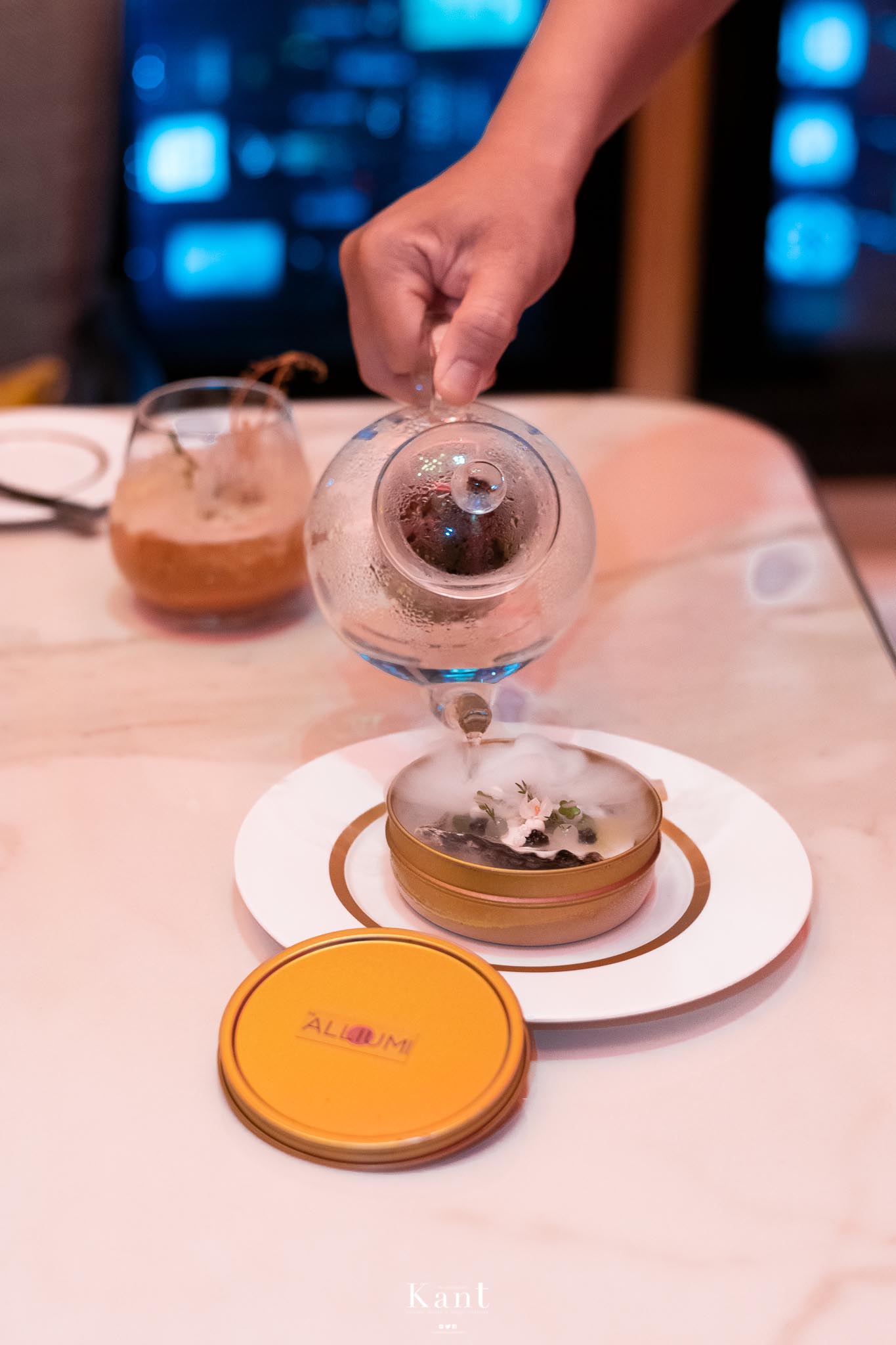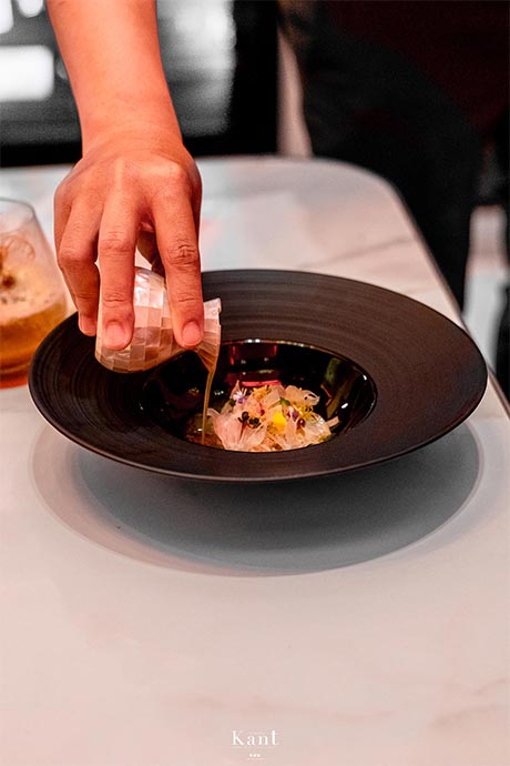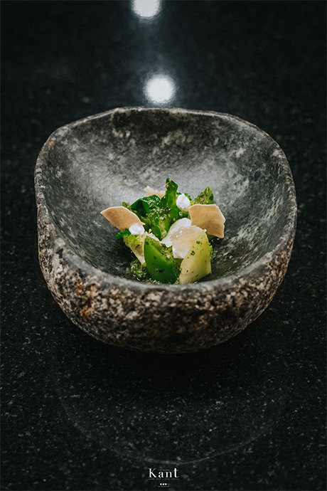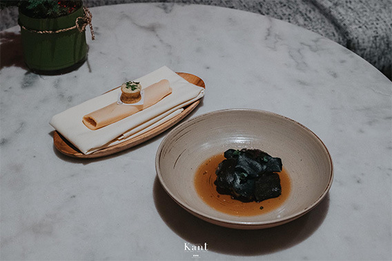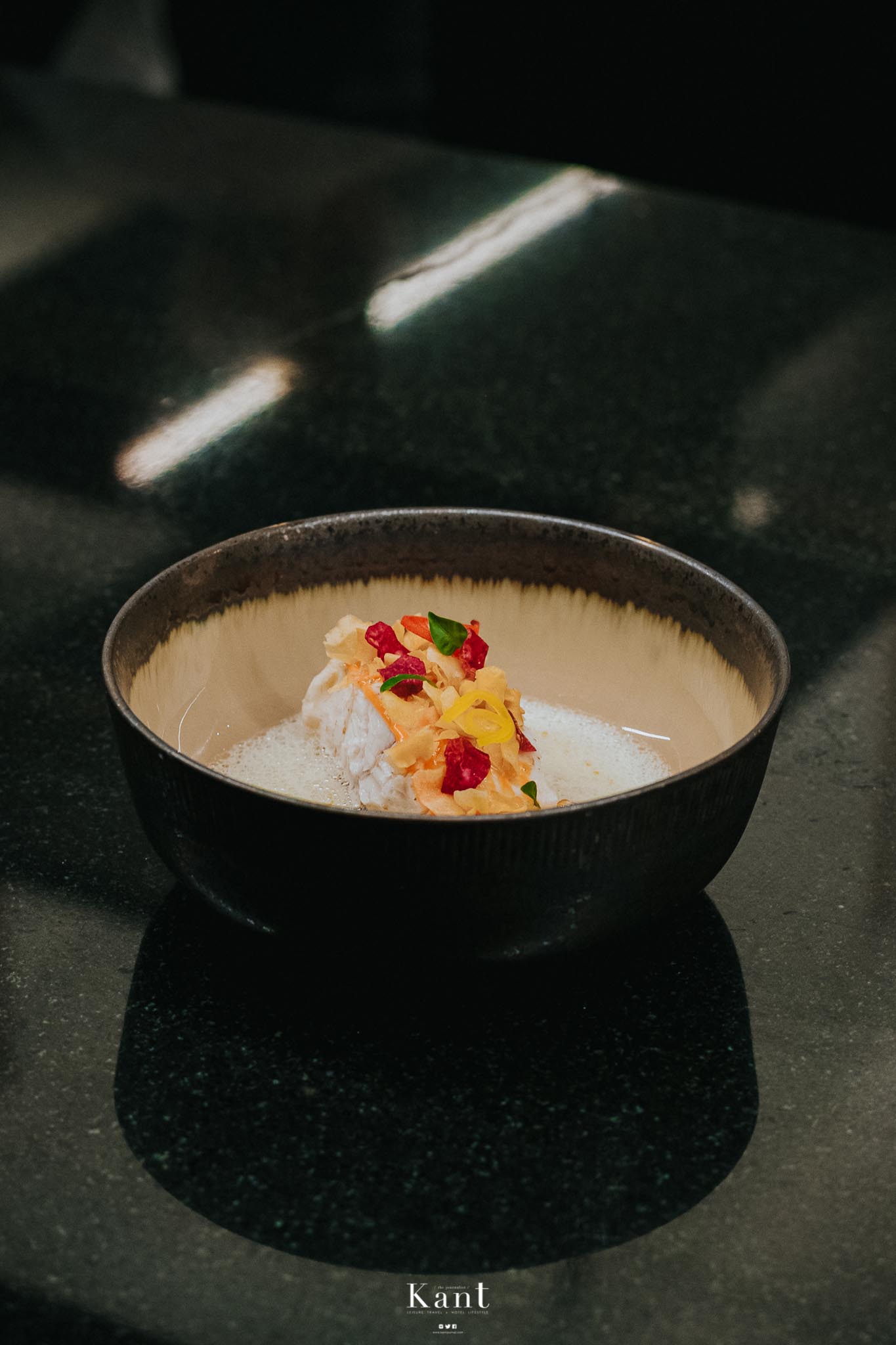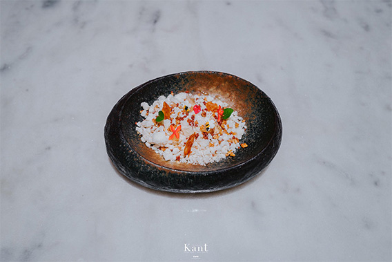 จากนั้น เชฟและทีมก็เริ่มบรรเลงคอร์สด้วย Cocollos oyster & Oscietra Caviar เชฟเลือกจานเปิดของเราเป็นหอยนางรมสายพันธุ์จากไอร์แลนด์ที่มีเท็กซ์เจอร์เนียนนุ่ม รสชาติละมุนลิ้นไม่เค็มโดด ปรุงรสด้วยน้ำแอปเปิ้ลเขียว ตกแต่งด้วย Daikon, Fennel, Shallot Pickle และ Sour Cream Terrine แล้วท็อปด้วย Crispy Pearl และ Oscietra Caviar เวลาเสิร์ฟจะมาพร้อมกับดรายไอซ์เย็นๆ บริกรจะเทซุปจากเหยือกแก้วลงบนกรวดที่รองเปลือกหอยไว้ทำให้เกิดไอเย็นสีขาวจากน้ำแข็งแห้ง จนกลายเป็นเมนูที่ดูมีชีวิตชีวา เวลาทานให้ใช้ช้อนตักทุกอย่างในคำเดียว จะสัมผัสถึงความนุ่มของหอยนางรม ผสมเครื่องเคราต่างๆ และความสดชื่นจากซอสแอปเปิ้ลและมีความ crispy เบาๆ