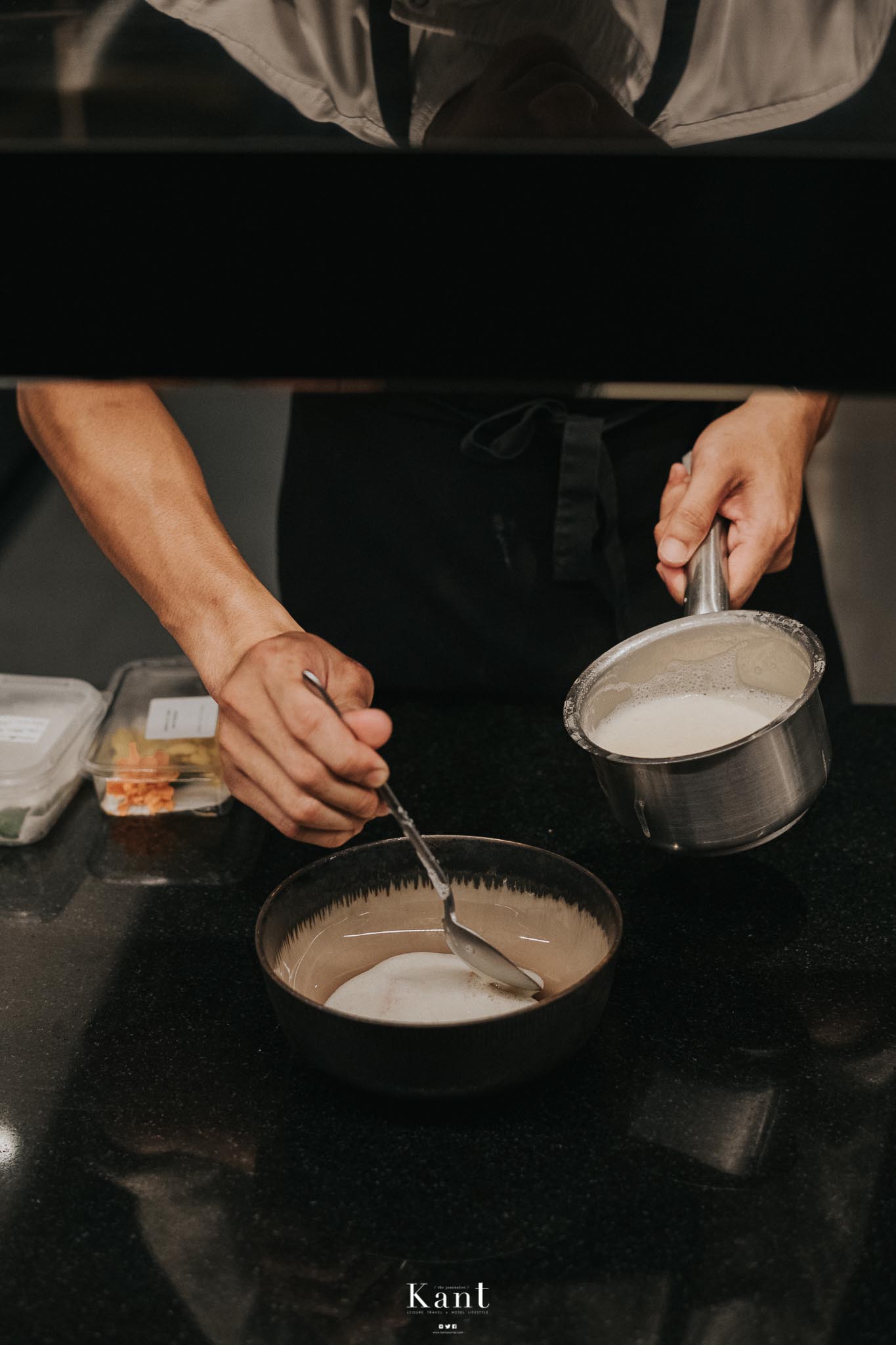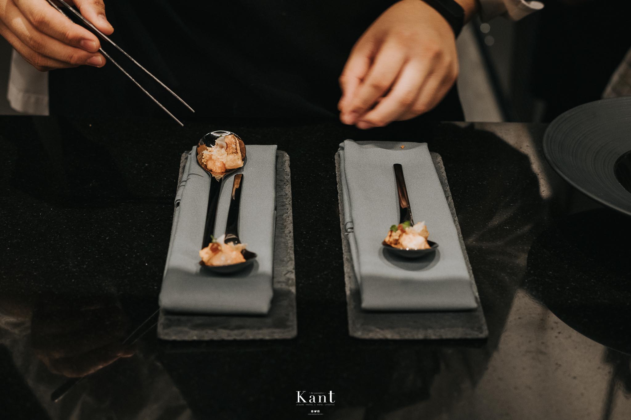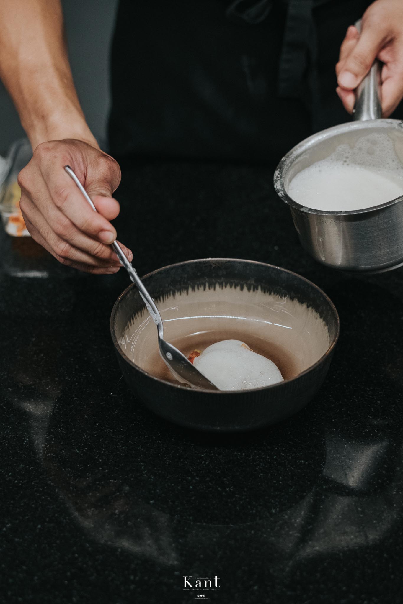 จากนั้น เชฟและทีมก็เริ่มบรรเลงคอร์สด้วย Cocollos oyster & Oscietra Caviar เชฟเลือกจานเปิดของเราเป็นหอยนางรมสายพันธุ์จากไอร์แลนด์ที่มีเท็กซ์เจอร์เนียนนุ่ม รสชาติละมุนลิ้นไม่เค็มโดด ปรุงรสด้วยน้ำแอปเปิ้ลเขียว ตกแต่งด้วย Daikon, Fennel, Shallot Pickle และ Sour Cream Terrine แล้วท็อปด้วย Crispy Pearl และ Oscietra Caviar เวลาเสิร์ฟจะมาพร้อมกับดรายไอซ์เย็นๆ บริกรจะเทซุปจากเหยือกแก้วลงบนกรวดที่รองเปลือกหอยไว้ทำให้เกิดไอเย็นสีขาวจากน้ำแข็งแห้ง จนกลายเป็นเมนูที่ดูมีชีวิตชีวา เวลาทานให้ใช้ช้อนตักทุกอย่างในคำเดียว จะสัมผัสถึงความนุ่มของหอยนางรม ผสมเครื่องเคราต่างๆ และความสดชื่นจากซอสแอปเปิ้ลและมีความ crispy เบาๆ