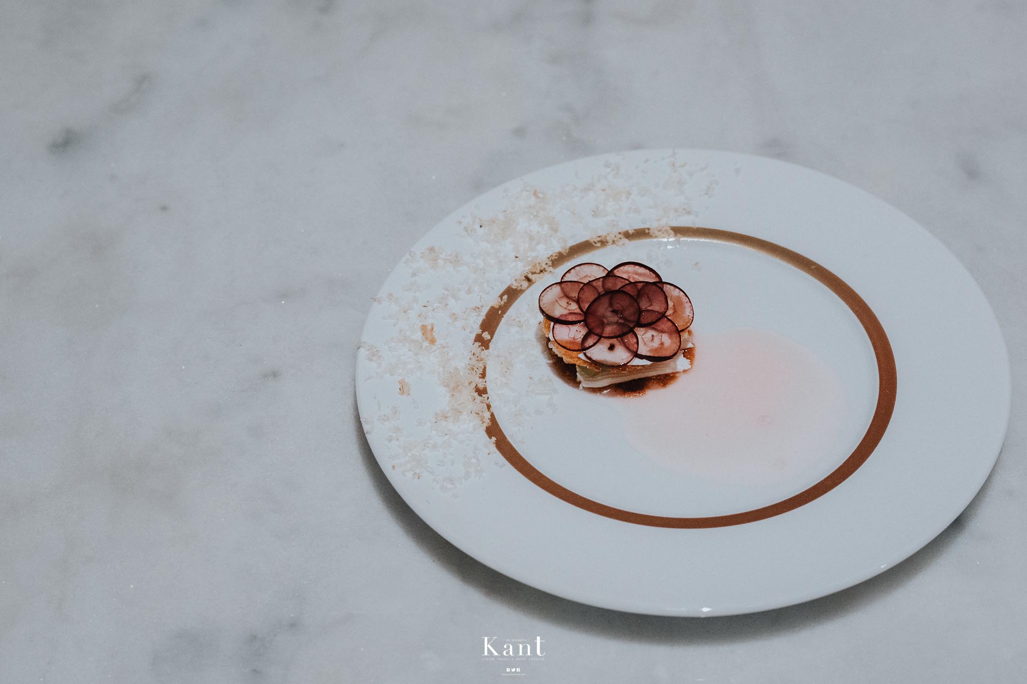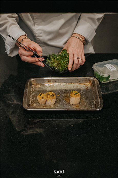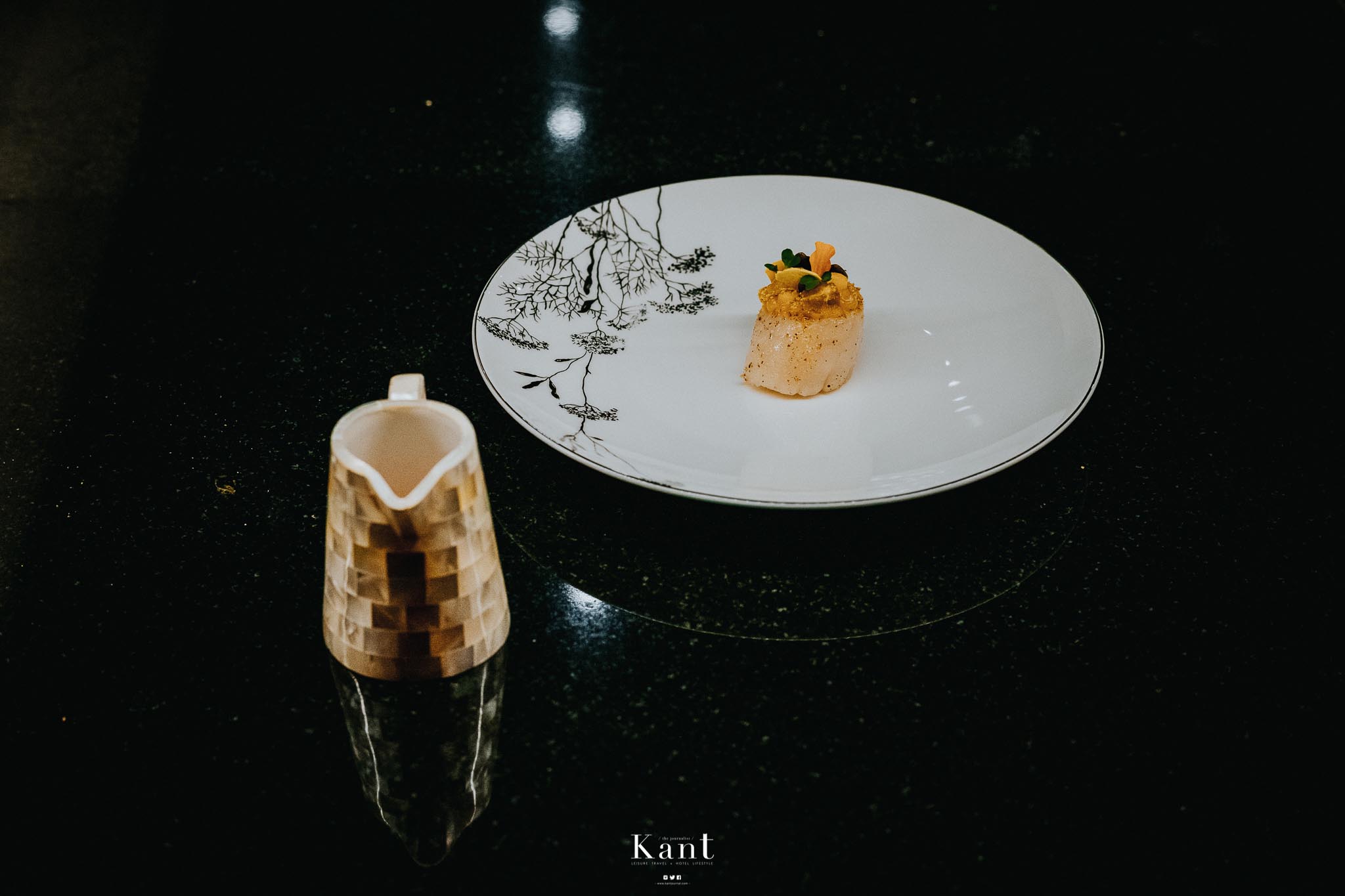 Hokkaido scallop & Pumpkin หอยเชลล์ฮอกไกโดขนาดใหญ่ที่เชฟได้ไอเดียมาจากตอนไปเที่ยวญี่ปุ่นแล้วได้มีโอกาสทานเทมปุระ ร้านมิชลิน 1 ดาว เชฟนำไปกองฟีเพื่อคงความนุ่ม ก่อนจะนำมาเข้าคู่กับฟักทอง ซึ่งเชฟนำไปทำเป็นพิวเร่เนื้อละเอียด มีฟักทองอบและเจลฟักทองรสชาติเปรี้ยว ปรุงรสด้วยซุปดาชิ ที่ให้ความอร่อยแบบอูมามิกันไปเลยทีเดียว
