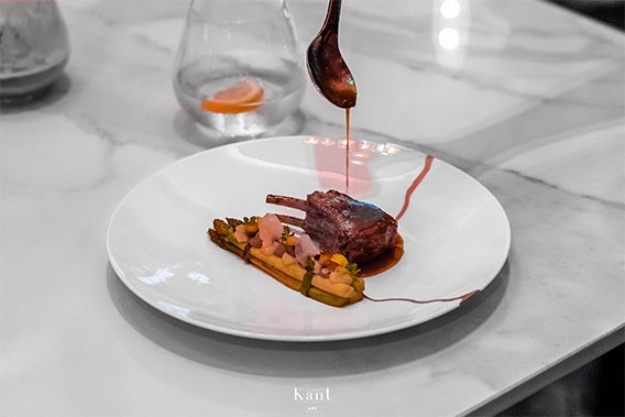 อีกจานเป็น Spanish Pyrenees Iberico Lamb rack & green asparagus เชฟเลือกแกะภูเขาจากสเปน ซึ่งจะโดดเด่นด้วยรสสัมผัสที่เป็นธรรมชาติ เพราะผ่านการดูแลอย่างดี มีความเป็นธรรมชาติในการเลี้ยง นำมาปรุงอาหารจะอร่อยไม่มีกลิ่นสาบ โดยเชฟนำแกะมาซูวีใช้อุณหภูมิ 56 องศา เป็นเวลา 1 ชั่วโมง จากนั้น นำไปเซียร์จนหนังกรอบ ทานคู่กับผักเคียงคือหน่อไม้ฝรั่งย่าง และเครื่องเคียงสมุนไพรนานา ไม่ว่าจะเป็น Potato Garlic Puree, Black Garlic, Roasted Garlic และ Smoked Lamb Neck