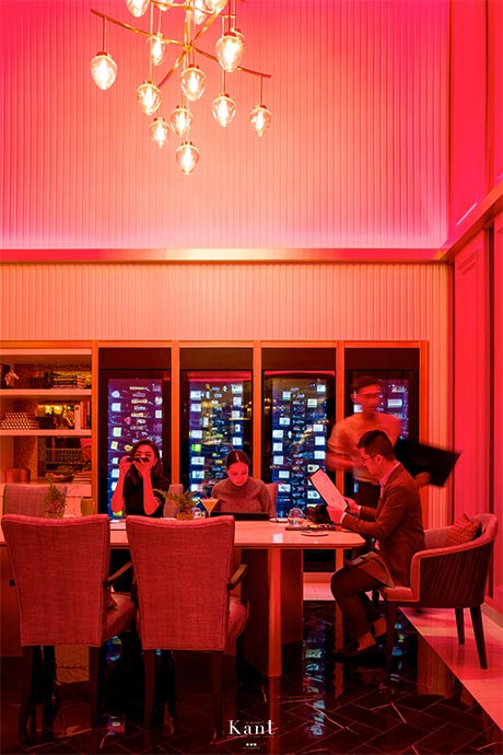มองไปรอบๆ มีโต๊ะทานข้าวที่จัดที่นั่งวางพอหลวมๆ ไม่รู้สึกอึดอัด ชั้นล่างมีห้องส่วนตัว ตกแต่งด้วยบรรยากาศเหมือนห้องรับแขกที่ทั้งหรูหราประดับผนังด้วยไวน์เซลล่ากว่า 200 ยี่ห้อ และเก๋ด้วยชุดโซฟาหน้าเตาผิงแบบดิจิทัล ส่วนชั้นลอยสามารถจองเป็นไพรเวทปาร์ตี้ได้เช่นกัน รับแขกได้แบบสบายๆ และเป็นส่วนตัวมากครับ