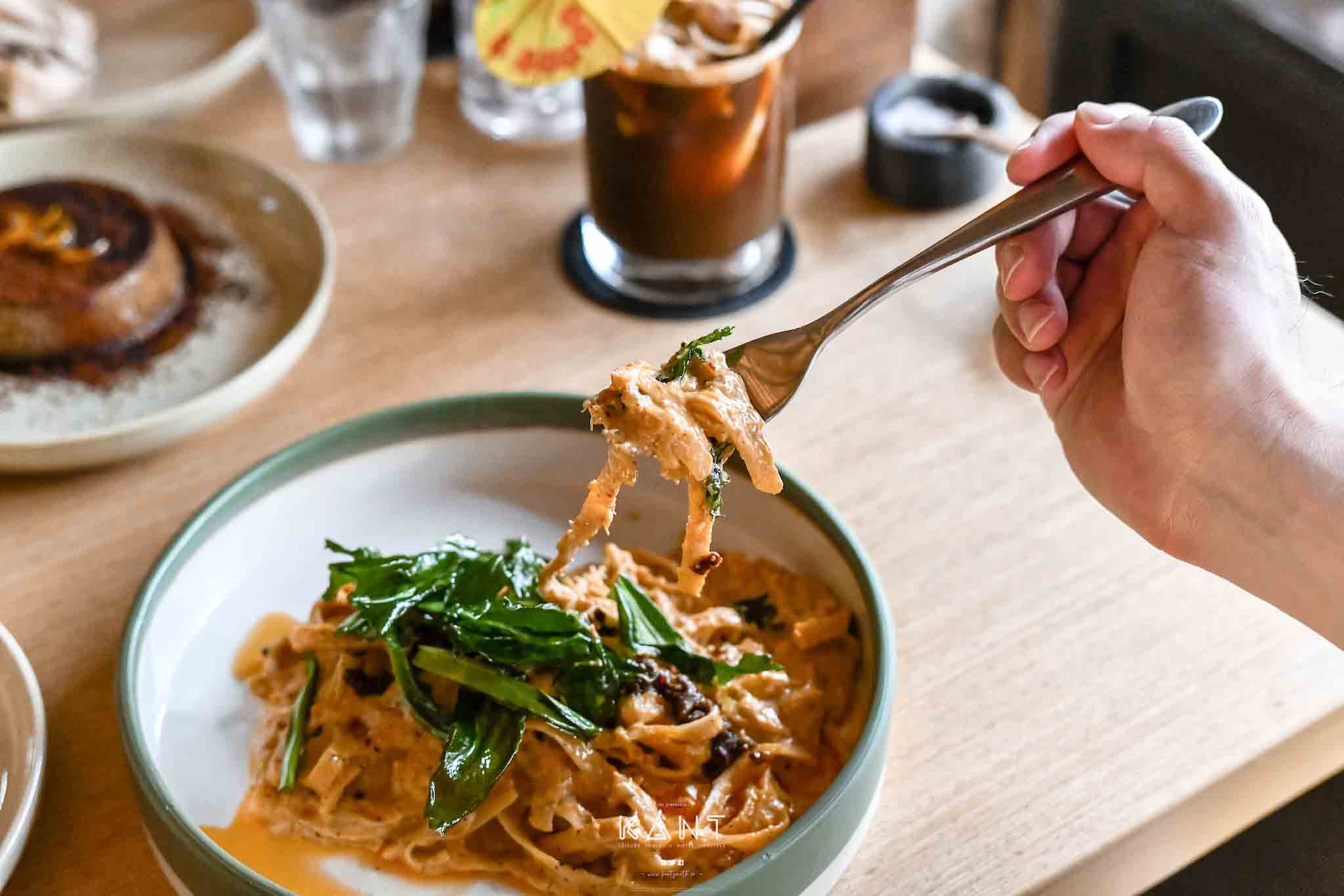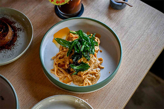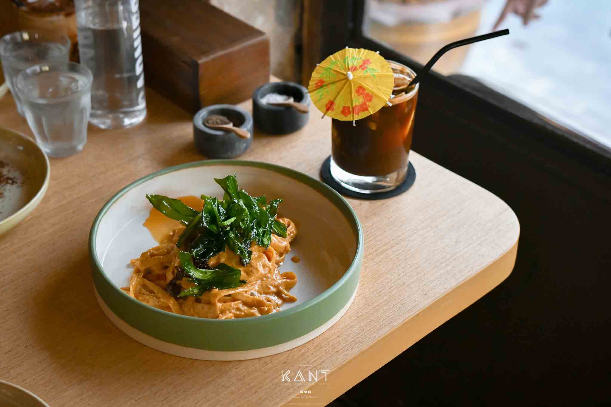กานต์ ลองสั่งอาหารมาทานบ้างครับ นอกจาก Salted Egg ซึ่งเอาพาสต้าไปผัดกับไข่เค็มและเนื้อปูทานคู่กับเครื่องดื่ม Iced Coconut long Black กาแฟมะพร้าว ก็เข้ากันดีครับ จานที่ชอบก็ยังมี CB&J เป็นเนยถั่วผสมน้ำผึ้ง ท๊อปด้วยองุ่นลูกโตที่อบมาแล้ว หอมหวานฉ่ำจากธรรมชาติมากๆ จานนี้เป็นวีแกนนะครับ ชอบหมดใจ