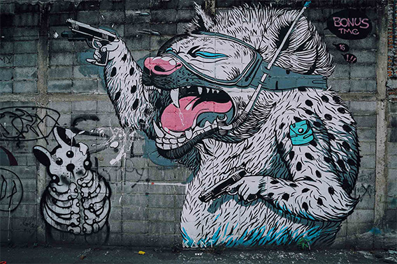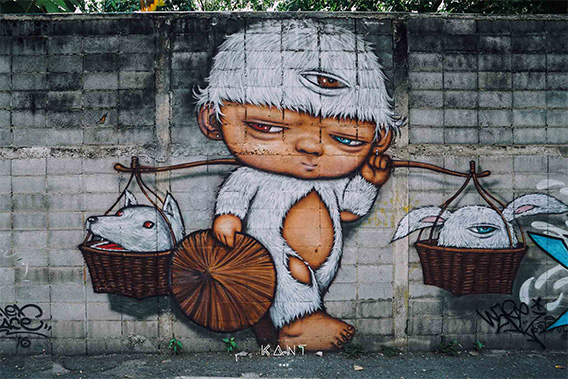 ไม่ไกลกันนัก กานต์ขับไปต่อกันที่ซอยเจริญกรุง 32 จะมีร่องรอยของงาน Street Art หลงเหลืออยู่ จากการจัดเทศกาลเมืองศิลปะ “บุกรุก” (BUKRUK Urban Atrs Festival)
