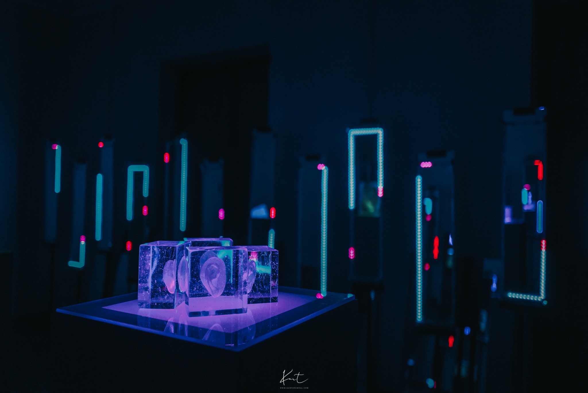 ชิ้นนี้ชื่อ SOCIAL DISTANCING 2020 โดยคุณฉัตตกาญจน์ วงษ์ศิริ เปรียบแสงที่กระทบแก้วเป็นเสมือนไวรัส ที่ยังอยู่กับเราแสงที่ส่องกระทบลงพื้นผิวแก้ว จะสร้างเงาและสีสันที่ส่องกระจายบนพื้นที่โดยรอบ ซึ่งเงาเหล่านั้นจะหมุนวนเคลื่อนที่อย่างช้าๆ แทนความรู้สึกของศิลปินที่ต้องการพูดถึงสถานการณ์โลกในตอนนี้ที่ทุกอย่างยังคงเคลื่อนไหว ทว่าทุกคนรับรู้ได้ว่าไวรัสอันตรายยังคงมีตัวตน แม้ตาจะมองไม่เห็น