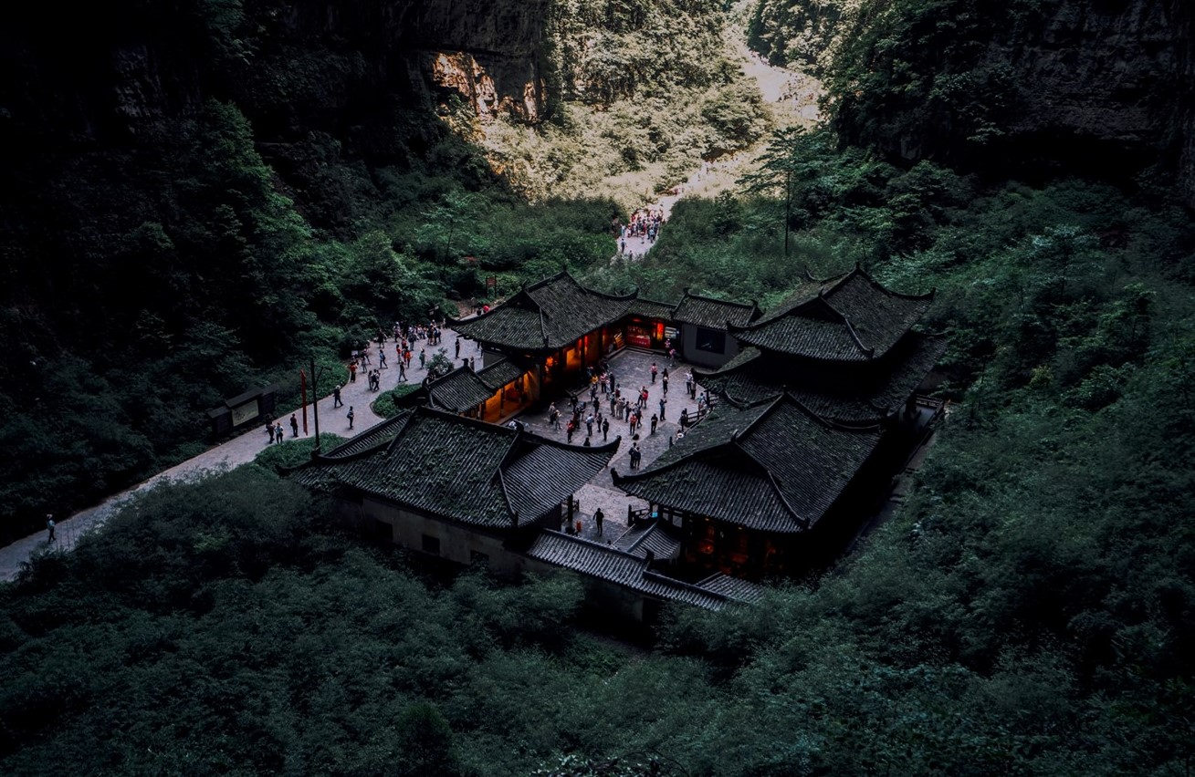 อวู่หลง เป็นเมืองตากอากาศ โอบล้อมด้วยภูเขาสูง มีแม่น้ำอู่เจียงไหลผ่านตั้งอยู่ทางตะวันออกเฉียงใต้ของฉงชิ่ง กลางคืน ตึกต่างๆ จะเปิดไฟสวยงามแข่งกัน