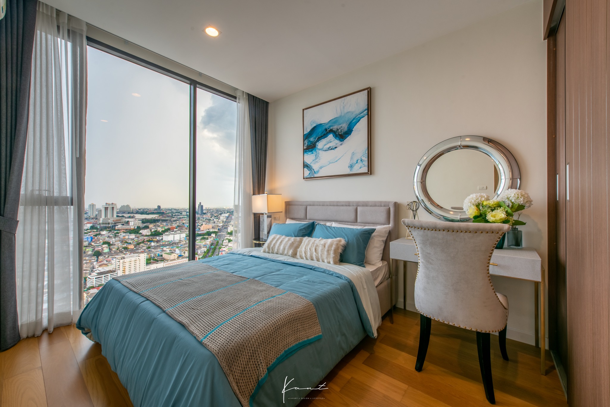 ส่วนภายในห้องนอนจะได้แอร์ 1 ตัว ฟังก์ชั่นภายในออกแบบจัดวางเตียงนอนขนาดใหญ่ไว้ชิดผนังกระจกอีกด้าน ทำให้สามารถชมวิวสวยๆ ของแม่น้ำเจ้าพระยาได้จากบนเตียงนอนกันเลยทีเดียวครับ หัวเตียงจัดวางโคมไฟและตู้เก็บของขนาดเล็ก ส่วนตู้เสื้อผ้าจะอยู่ติดผนังอีกด้านของห้องเป็นตู้บานไม้สีน้ำตาลขนาดใหญ่สูงจรดเพดาน ติดกันเป็นโต๊ะเครื่องแป้งและปรับให้เป็นมุมนั่งทำงานอ่านหนังสือได้ในตัว