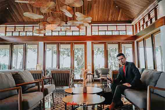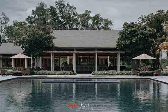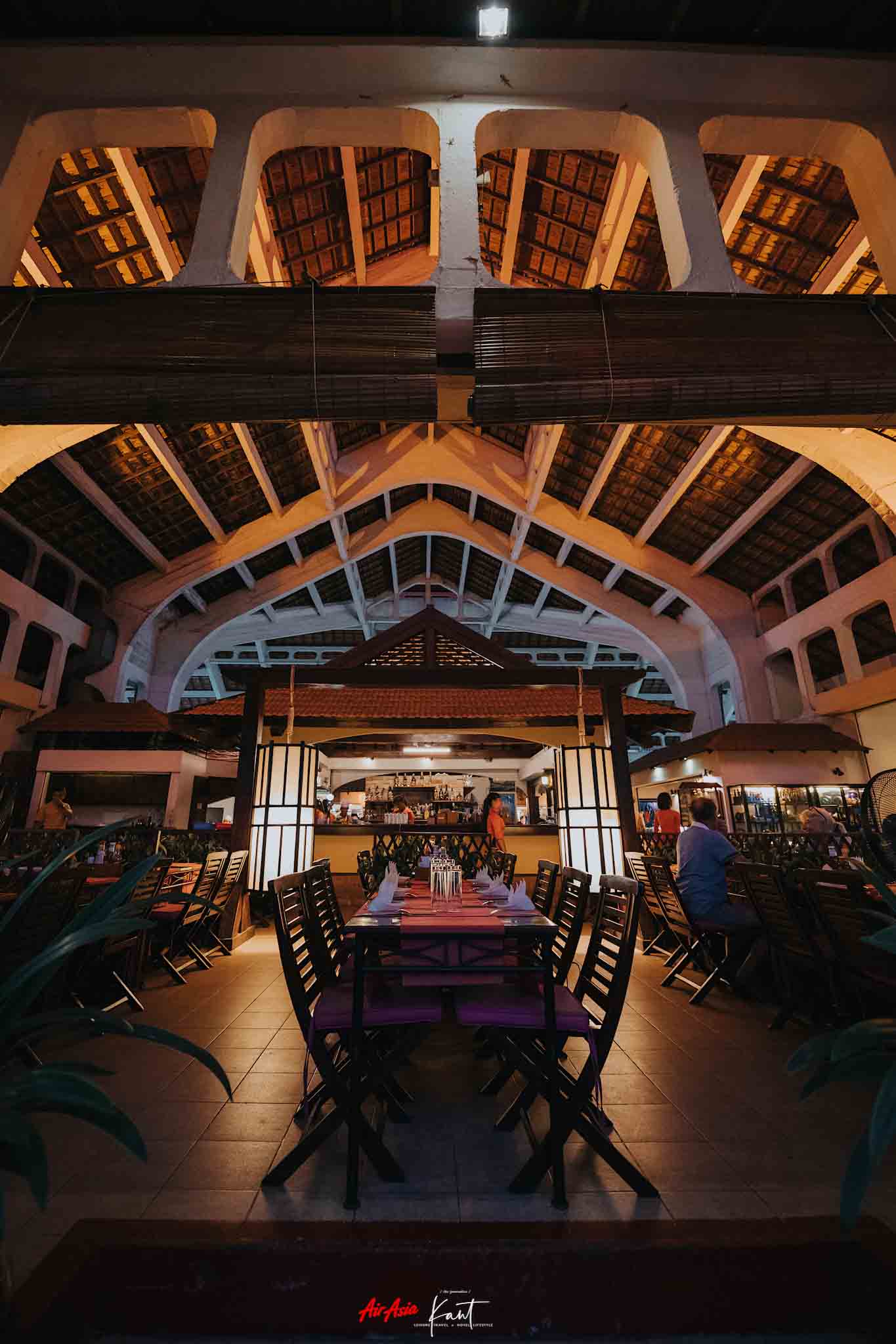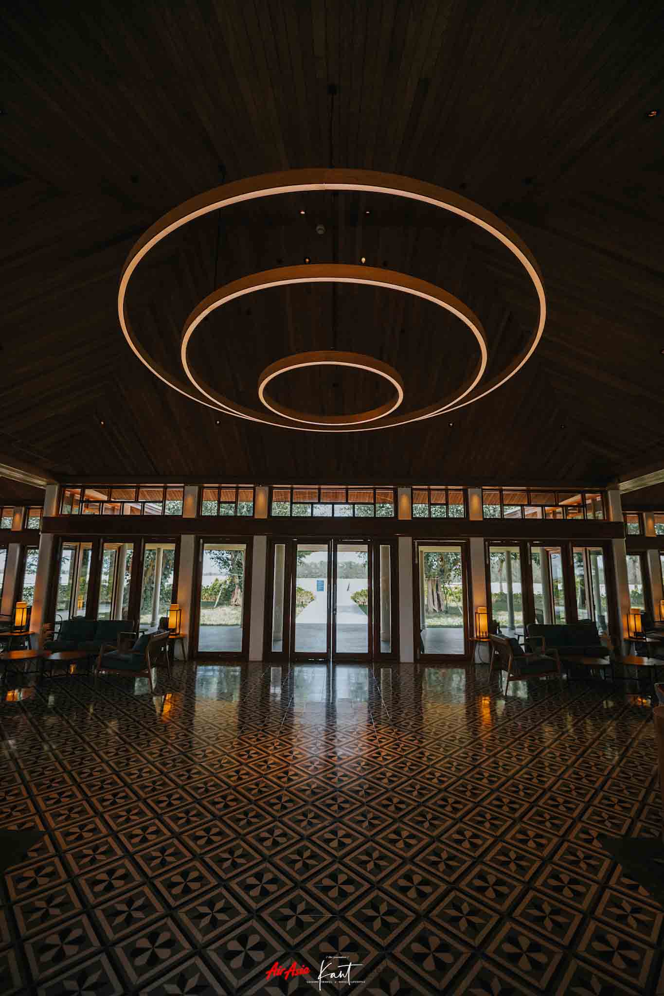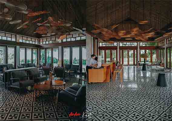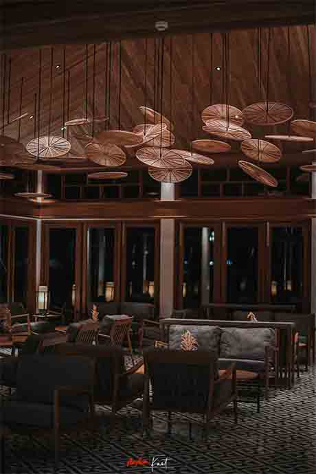 บรรยากาศภายใน Azerai Arrival Pavilion กว้างขวางและโอ่อ่ามากครับ เป็นอาคารไม้ดีไซน์แปลกตา บริเวณโดยรอบร่มรื่นดี ผมชอบโคมไฟที่ห้อยมาจากฝ้าเพดานมากๆ ครับ ดูเก๋ดี เข้าใจว่าได้รับอิทธิพลในการออกแบบมาจากธูปยักษ์ของเวียดนามที่เป็นขดๆ วงๆ ที่ตรงนี้จะเป็นจุดรอเรือมารับเพื่อจะล่องไปตามแม่น้ำ เพื่อข้ามไปยังรีสอร์ตซึ่งเป็นเกาะ