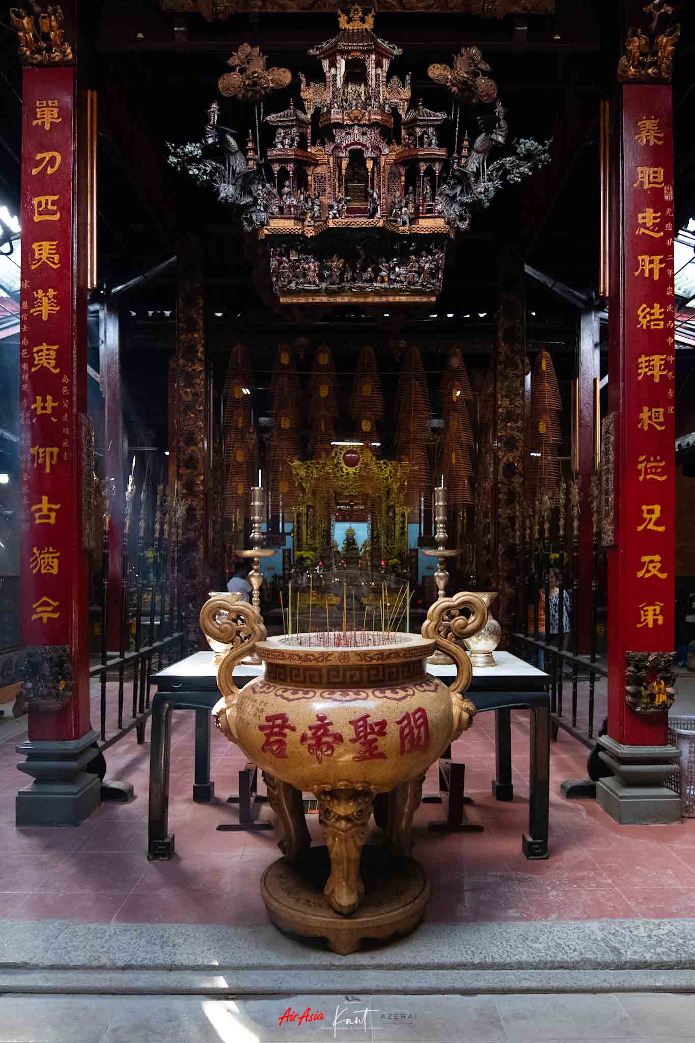 บางคนเรียกอ่อง ผมเรียกอ๋อง เพราะจะได้จำง่าย คล้ายๆ กับท่านอ่อง เพราะที่นี่เป็นวัดสถาปัตยกรรมจีน ตั้งอยู่ติดกับแม่น้ำ สร้างมาตั้งแต่สมัยปลายศตวรรษที่ 19 เพื่อบูชา Kuang Kung ซึ่งเป็นเทพสัญลักษณ์แห่งความภักดี ความฉลาดหลักแหลม มีเหตุผล มีความยุติธรรม มีเกียรติและความกล้าหาญ บริเวณด้านซ้ายและขวาของเทพ จะมีขนาบด้วยเทพแห่งโชคลาภ โดดเด่นเรื่องการเงิน และเทพแห่งดิน คอยให้ความคุ้มครองความปลอดภัย ตลอดทั้งวันจะมีมาไหว้ไม่ขาดสาย วัดอยู่ไม่ไกลจากสวนสาธารณะโฮจิมินห์เกิ่นเทอมากนัก เดินได้สบายๆ ครับ