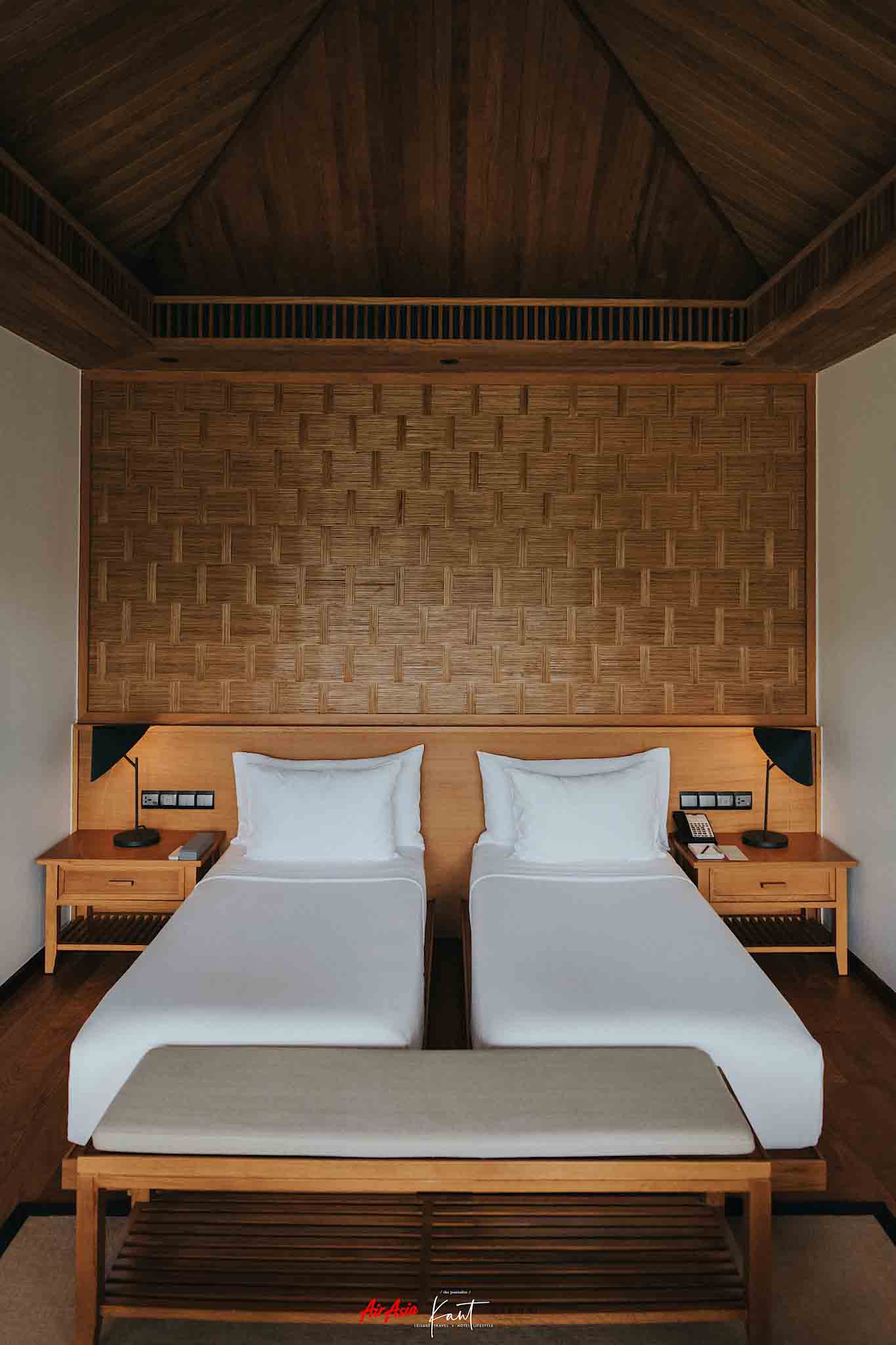 ห้องพักได้รับการออกแบบด้วยวัสดุที่มาจากท้องถิ่นเป็นหลัก ใช้โทนสีที่เป็นกลาง อย่างน้ำตาล เพื่อสื่อสารความเป็นธรรมชาติออกมา นำเอาองค์ประกอบของสถาปัตยกรรมพื้นถิ่น เช่น เพดานสูงแหลม ช่วยให้การระบายอากาศดีขึ้น โดยเฉพาะในช่วงวันที่อากาศอบอุ่น ส่วนตัวชอบโคมไฟที่ออกแบบคล้ายกับหมวกงอบเวียดนามครับ อยากขอซื้อกลับไทย แต่เค้าไม่ยอมขาย