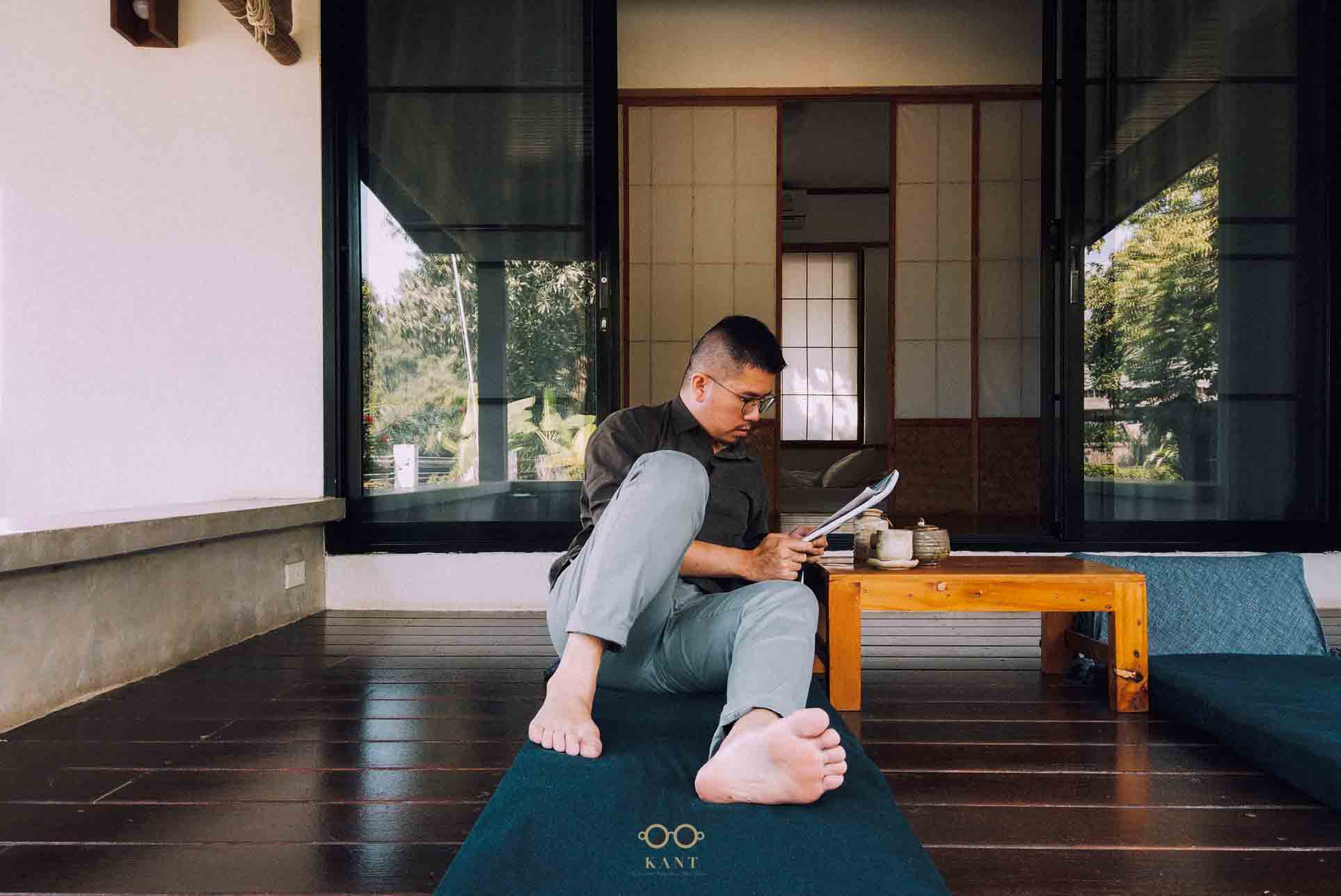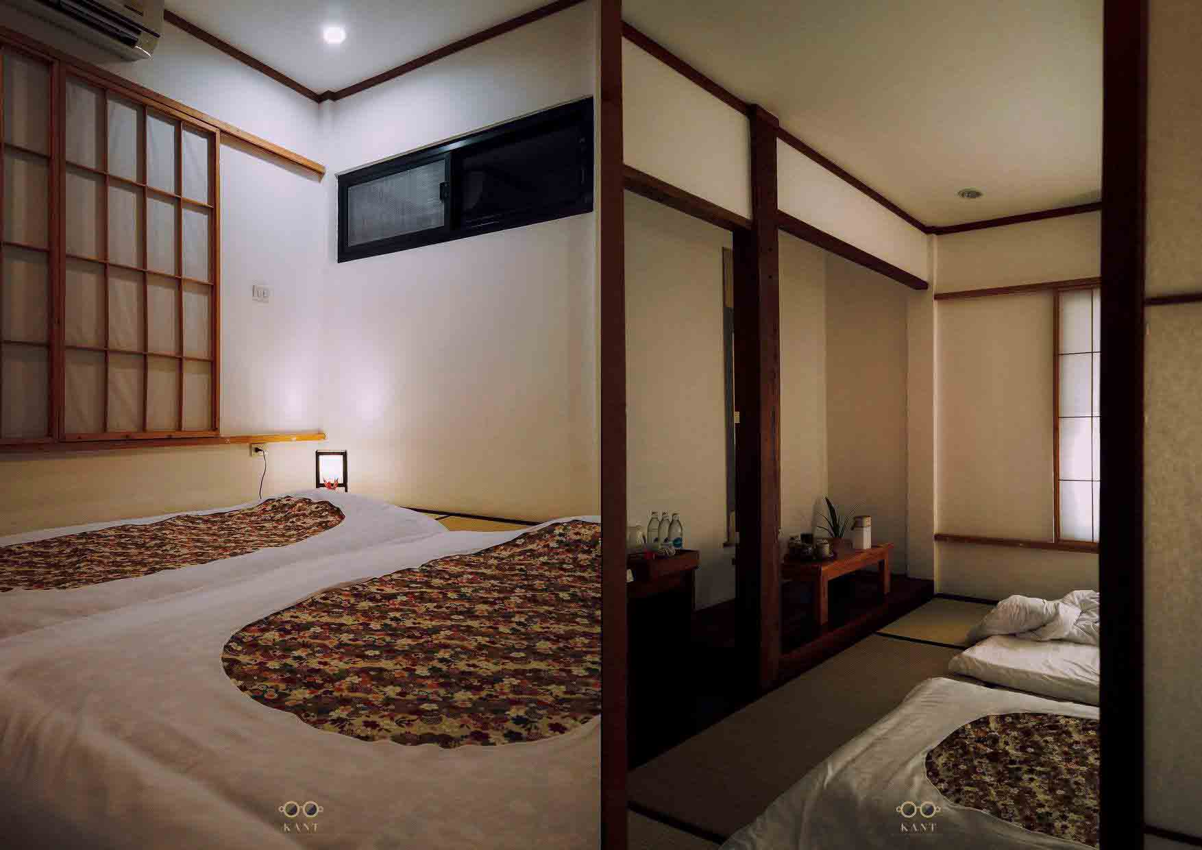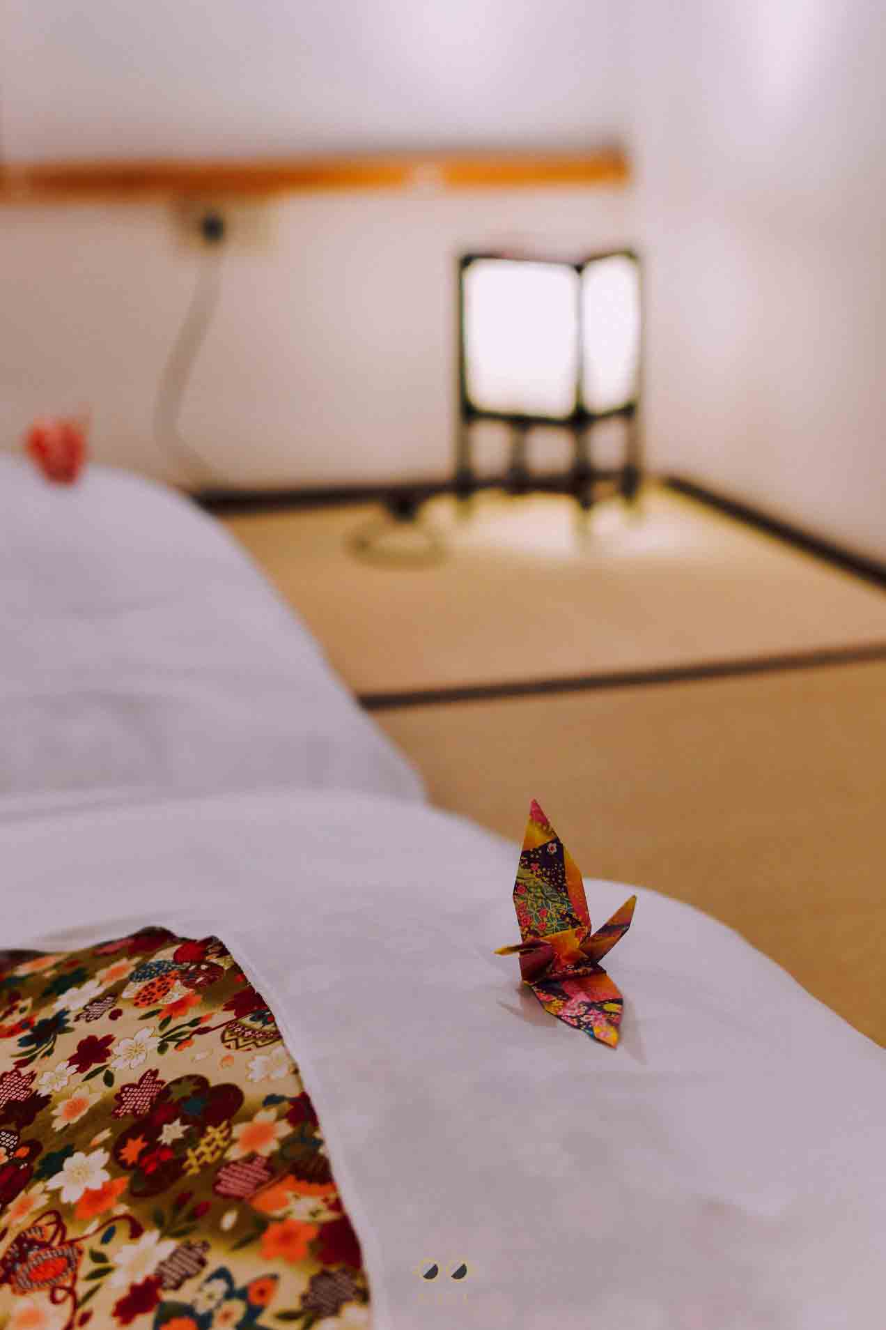 เจ้าของเป็นสถาปนิกครับ ผมว่าเขาเก็บรายละเอียดการออกแบบได้ดี ภายในมีเสื่อ “ตาตามิ” (Tatami) ที่ใช้ใยกกมาทอแทนหญ้าอิคุสะ เนื่องจากไม่ค่อยทนทาน มีประตูบานเลื่อน “โชจิ” (Shoji) ที่กรุด้วยกระดาษฟางข้าวสีขาวนำเข้าจากญี่ปุ่น เหมือนที่เราเห็นในหนังนั่นแหละครับ พอตกค่ำ พนักงานก็จะเลื่อนโต๊ะน้ำชาออกแล้วนำฟูกแบบฟุตง (Futon) มาปู เพื่อจัดเตรียมเครื่องนอนให้กับผู้เข้าพัก พร้อมกับวางนกกะเรียนพับไว้ เป็นสัญลักษณ์ถึงความเอาใจใส่ในการดูแลตามนิทานพื้นบ้านญี่ปุ่น