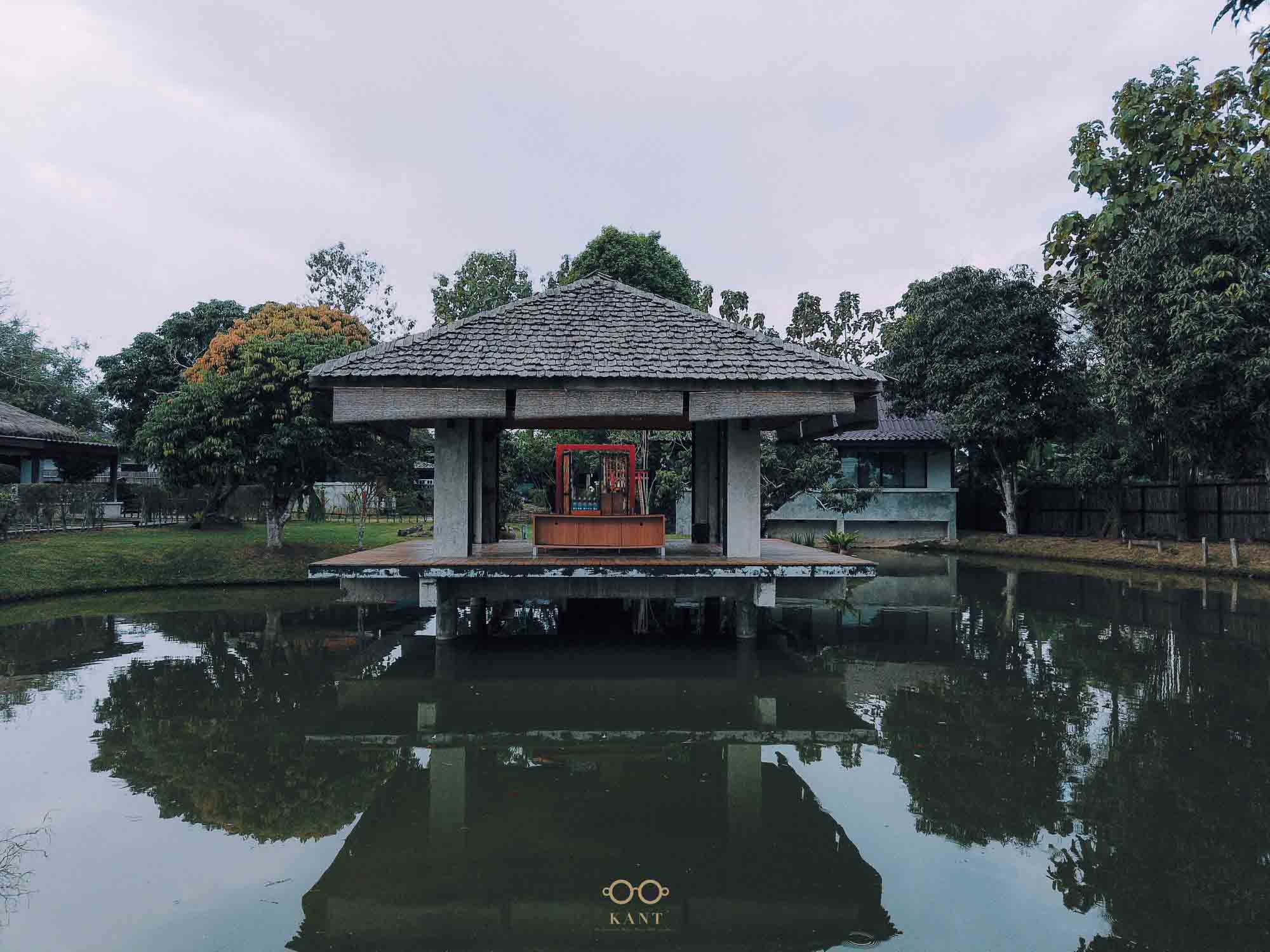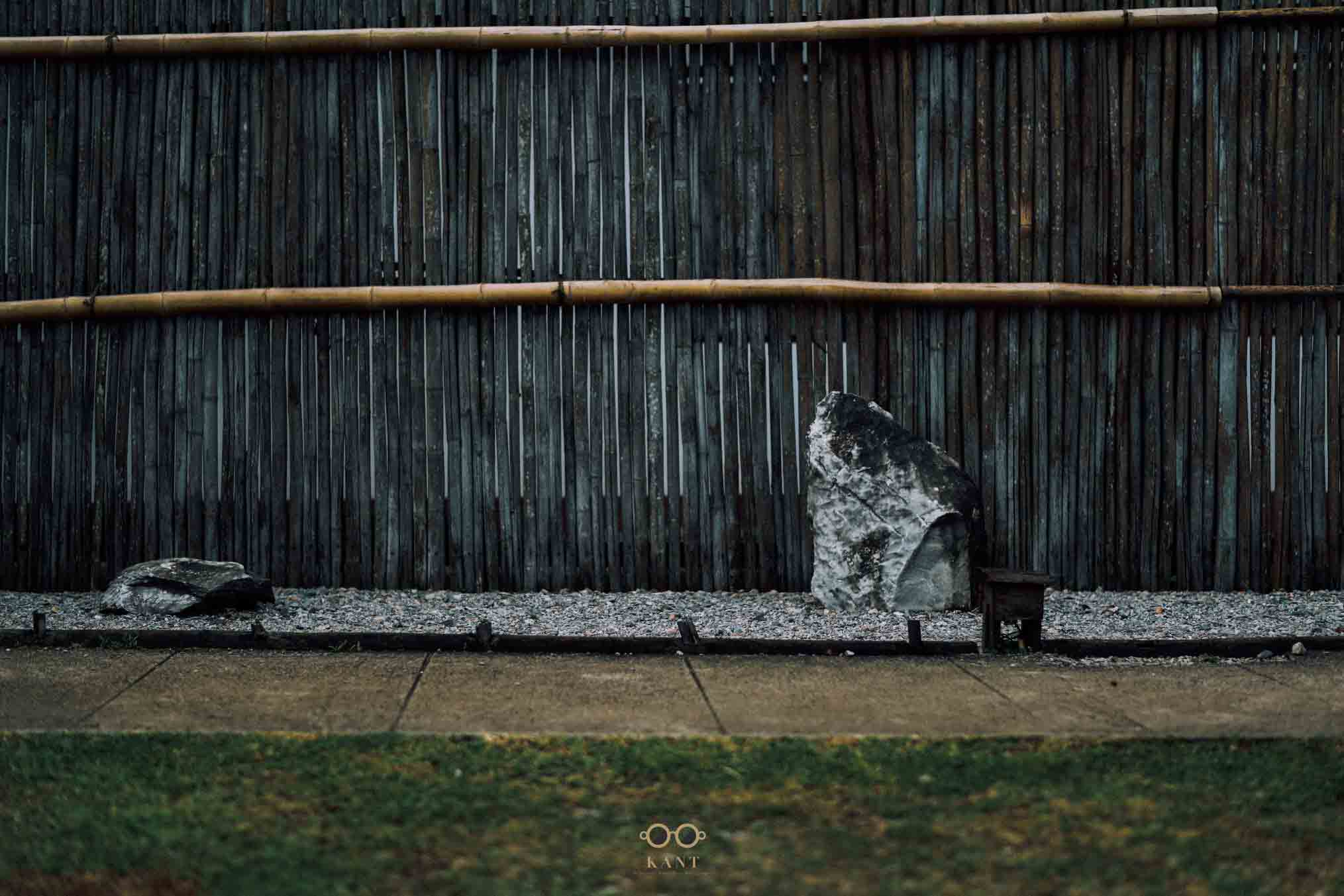 มองออกไปจากด้านหน้าเรียวกัง จะเป็นศาลากลางน้ำเพื่อให้ผู้เข้าพักได้มาใช้พื้นที่ในการพักผ่อน ทำกิจกรรมร่วมกัน ในบรรยากาศของสวนญี่ปุ่น และมีสวนหินสไตล์เซ็นที่จัดแสดงไว้บริเวณภายในเรียวกัง