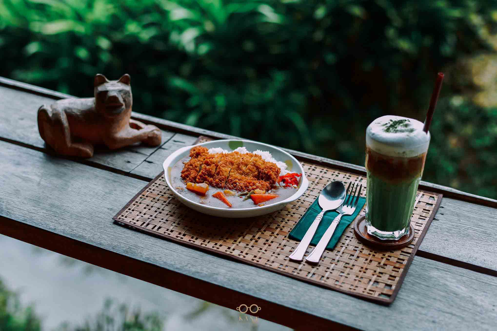เมื่อก่อนนี้ เรียวกังคาเฟ่ไม่มีอาหารขาย แต่เห็นว่าลูกค้าถามหาเยอะ ตอนหลังได้พัฒนามาเสิร์ฟข้าวแกงกะหรี่หมูทอด อร่อยมากครับ เป็นน้ำแกงสไตล์ญี่ปุ่นแท้ๆ ทานคู่กับชาเขียวกาแฟ เรียวกัง ลาเต้ (Ryokan Latte) เป็นเมนูซิกเนเจอร์ของทางร้าน
