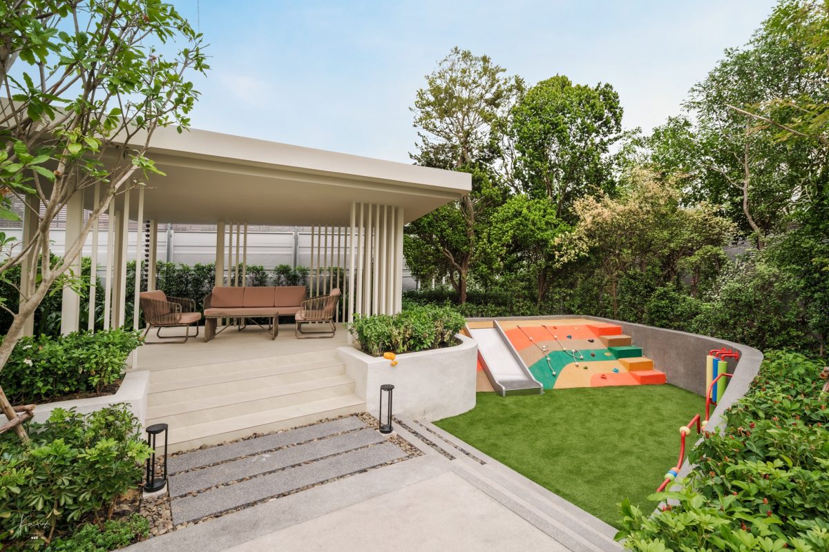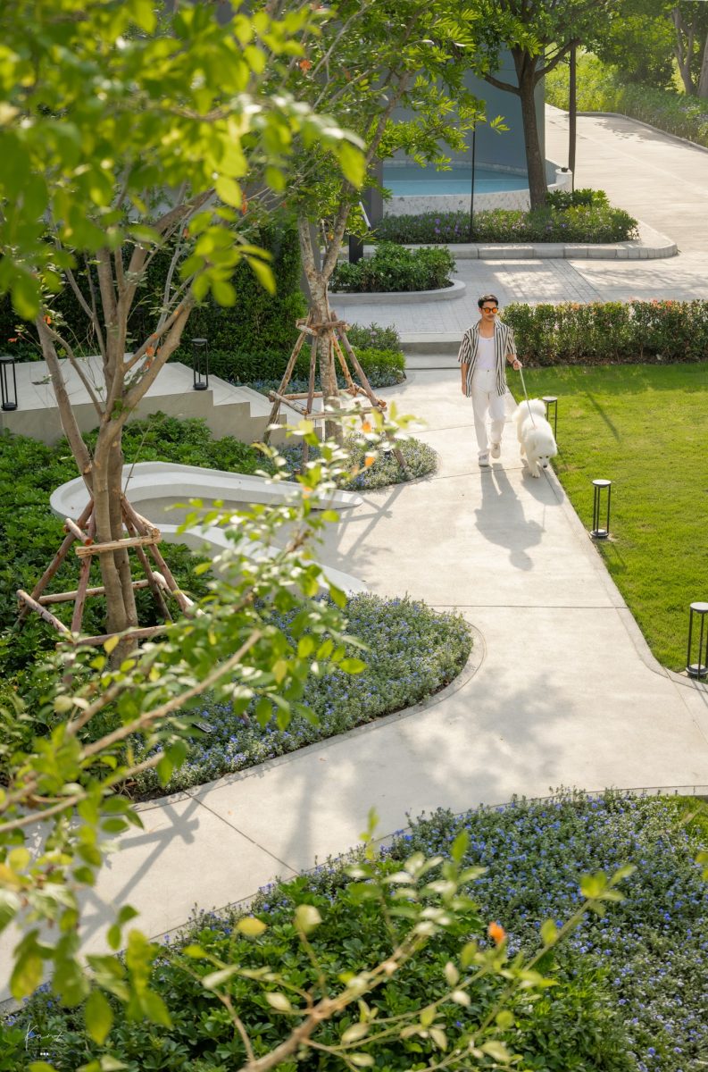 ส่วนด้านนอกพื้นที่สีเขียวส่วนกลาง น่าจะเป็นส่วนที่ตอบคำถามเรื่องการดูแลเอาใจใส่มากที่สุด สะท้อนว่าโครงการนี้คิดถึงคุณภาพชีวิตระยะยาว ไม่ใช่แค่หน้าตาตอนขาย ทางเดิน Curve เล็กน้อยผ่านสวนที่จัดภูมิทัศน์อย่างตั้งใจ ต้นไม้ขนาดกลาง ไม้พุ่มและพื้นหญ้าจัดสลับชั้นกัน มี Shaded Seating ไว้นั่งพัก มีมุมเล่นสำหรับเด็กเล็ก ตอนเช้าๆ เราสามารถพาน้องหมาไปเดินเล่นในสวนได้หรือเราจะวิ่งออกกำลังกายไปพร้อมกันเป็นเป็นไอเดียที่ดี กานต์มองว่าที่นี่ก็มีความ Friendly กับสมาชิกทุกคนในครอบครัว รวมถึงสมาชิก 4 ขาของเราด้วยครับ