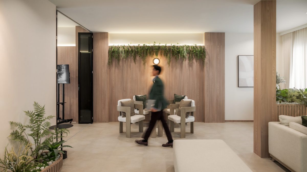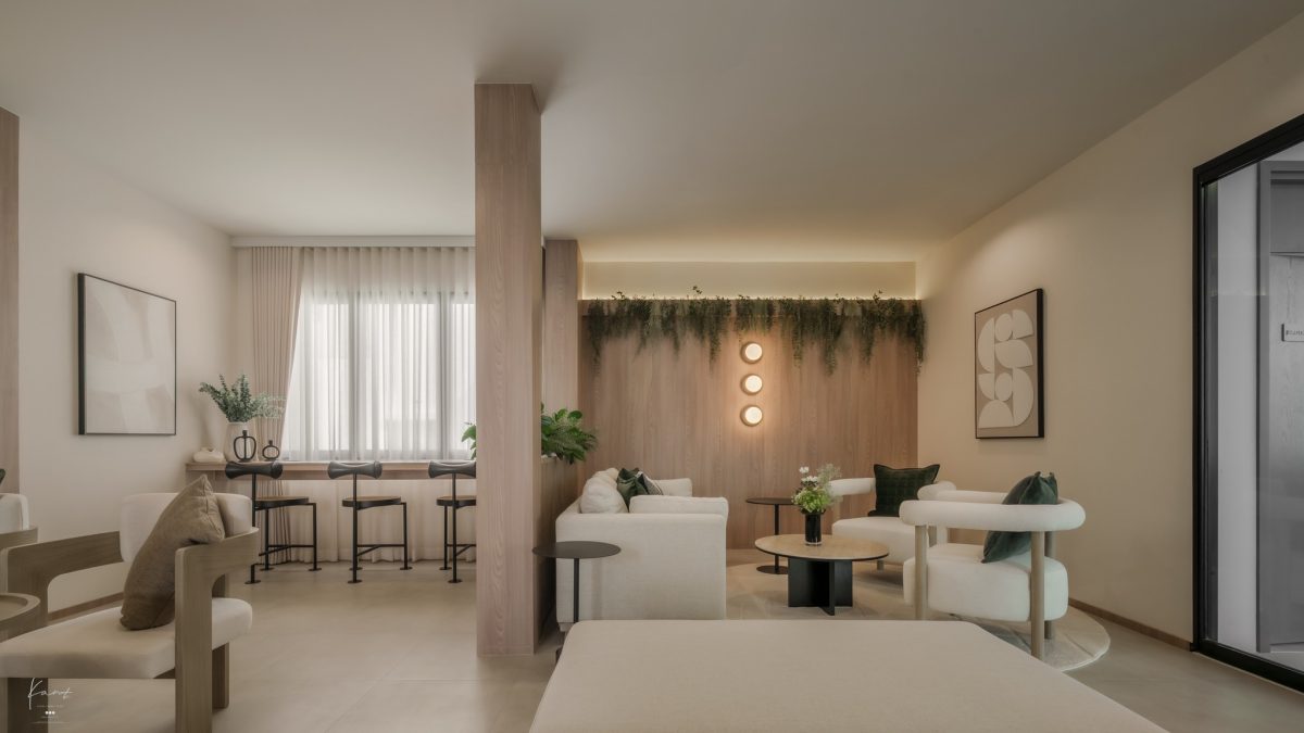 Co-Working Space จัดวางที่นั่งกระจายกันไปในหลายจุดให้เลือกมีทั้งโต๊ะยาว ชุดโซฟานั่งเล่น เก้าอี้บาร์ทรงสูงริมหน้าต่าง การตกแต่งใช้ Wood Panel โทนอุ่นเป็นผนังหลัก สลับกับพื้นที่สีขาวและต้นไม้ที่วางตลอดแนวเพดานในลักษณะ Living Wall สร้าง Texture ที่มีชีวิตโดยไม่ต้องพึ่งสีสันฉูดฉาด แสง Indirect Lighting ที่ขอบเพดานให้ความรู้สึกอบอุ่นได้ฟีลลิ่งแบบโรงแรม Boutique