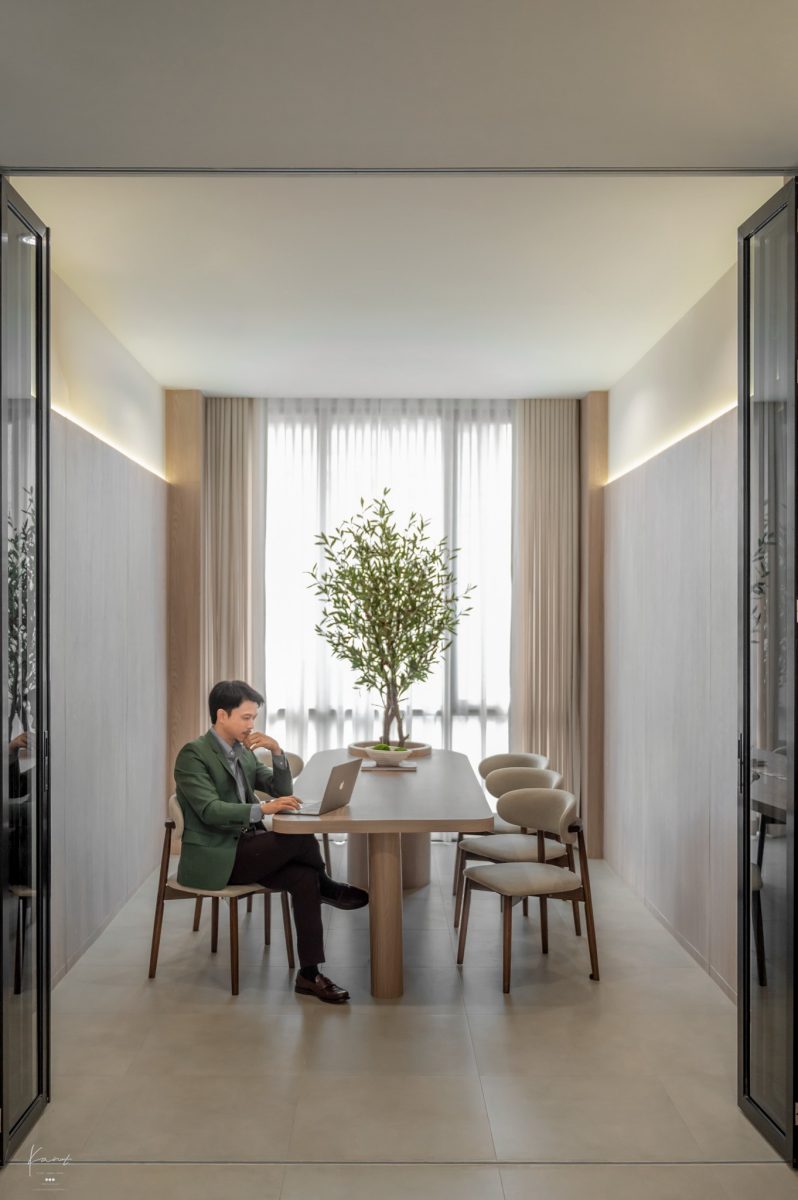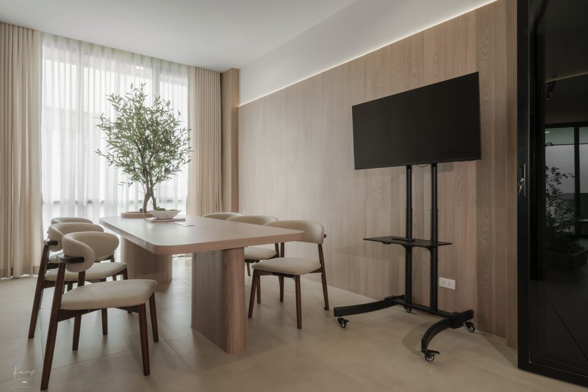 ภายในห้องประชุมมีโต๊ะยาวรองรับได้หลายคน มีจอ TV ที่ขยับตำแหน่งได้ตามความต้องการ มีต้นไม้ตั้งตรงกลางโต๊ะเล็กน้อยพอให้รู้สึกว่านี่ไม่ใช่ห้องประชุมเครียดๆ แต่เป็นพื้นที่ทำงานส่วนตัวที่รู้สึกดี