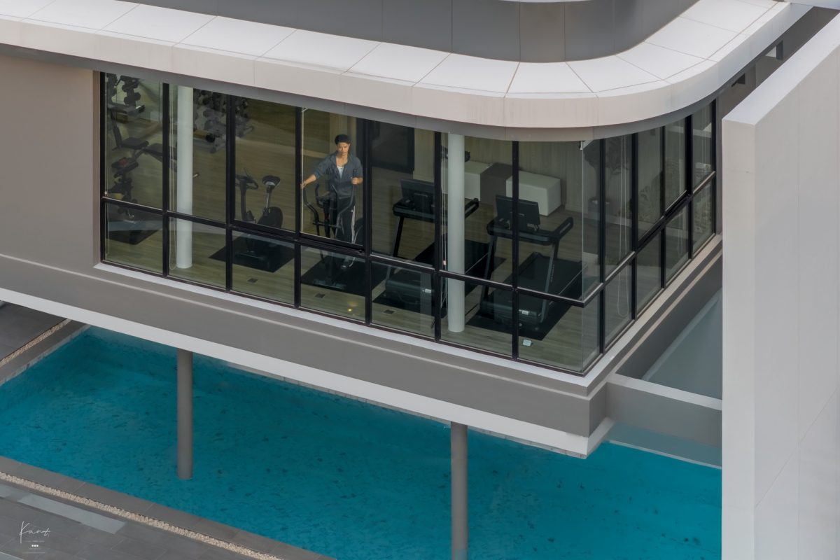 ในส่วนของ Fitness หันหน้าออกมาทางด้านหน้าโครงการผ่านผนังกระจกใส Full Height สูงถึงฝ้า และยังมองเห็นสระว่ายน้ำที่อยู่ด้านล่างด้วย พื้นปูไม้ Wood Tone อุ่น ผนังด้านหนึ่งเป็น กระจกเงาสำหรับเช็คท่วงท่าในการออกกำลัง ส่วนอีกด้านเป็น Green Wall ให้ความรู้สึกเปิดโล่งและสดชื่น