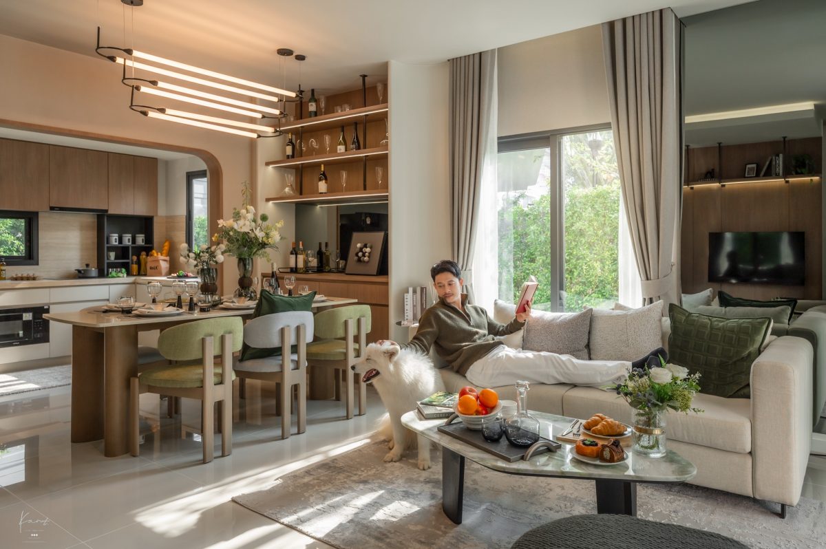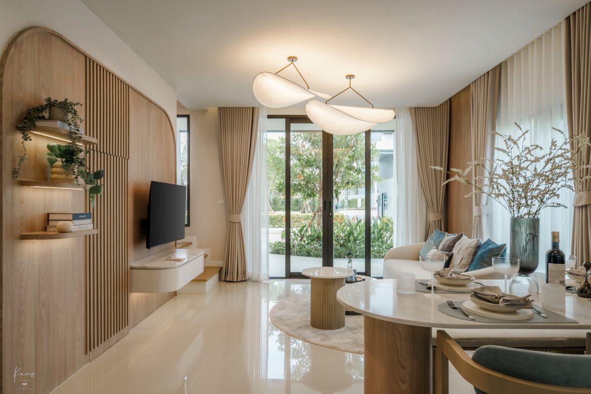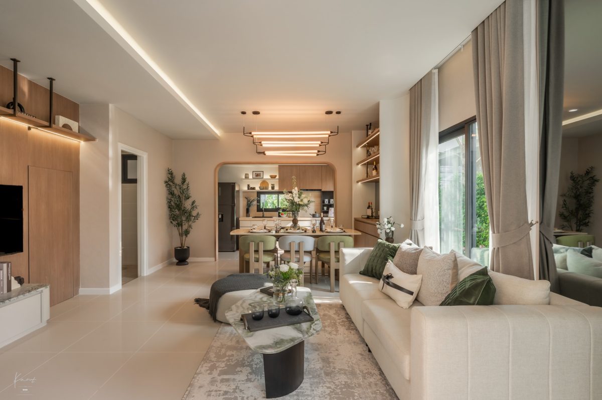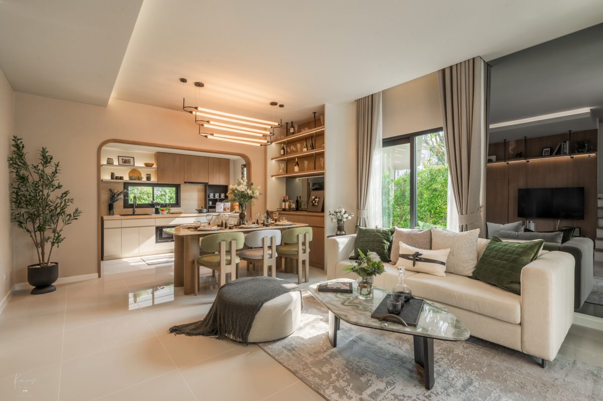 ภายในบ้านเปิดรับแสงธรรมชาติเข้ามาภายใน และมีผนังกระจกที่มองออกไปเห็นต้นไม้ (สำหรับบ้านหลังมุม) สีของภายในบ้านเป็นโทนครีม-เบจ วัสดุพื้นเป็นกระเบื้องแกรนิตโต้สีอ่อนที่ดูแลง่าย เพดานมีแสง LED กรุ่มๆ เพิ่มความอบอุ่นในยามค่ำ