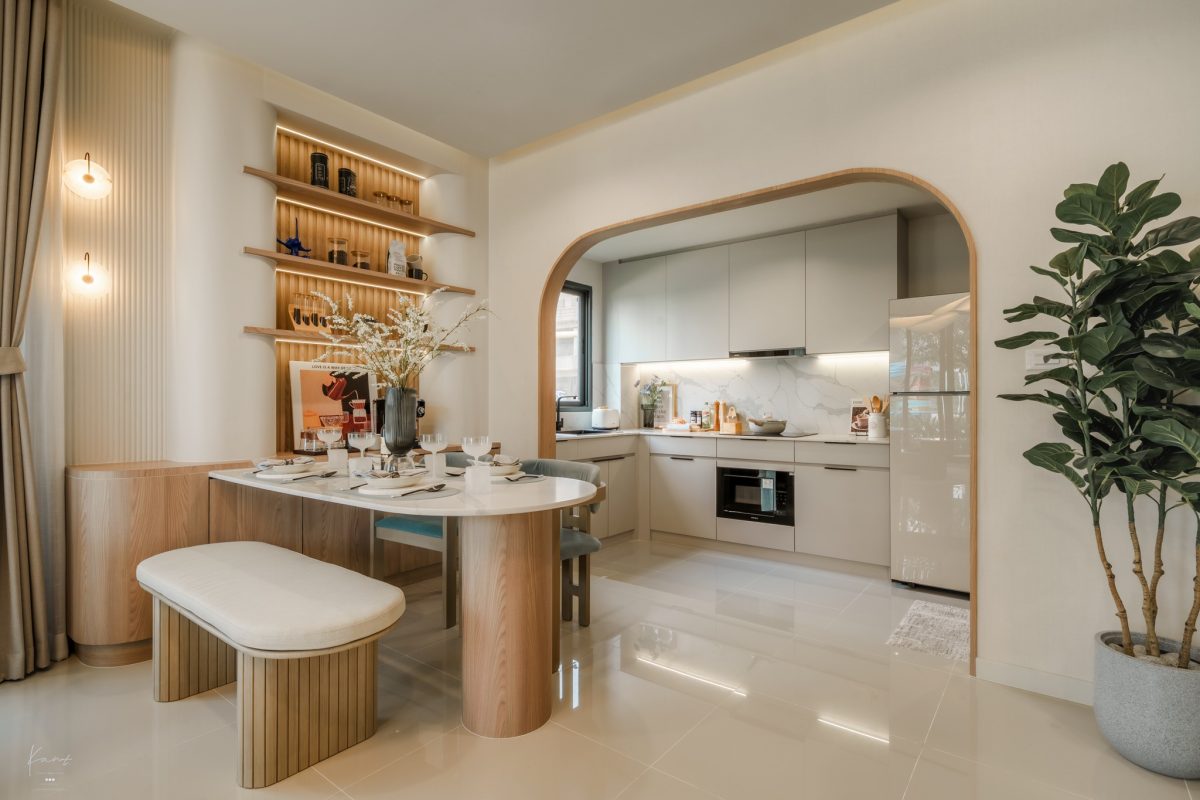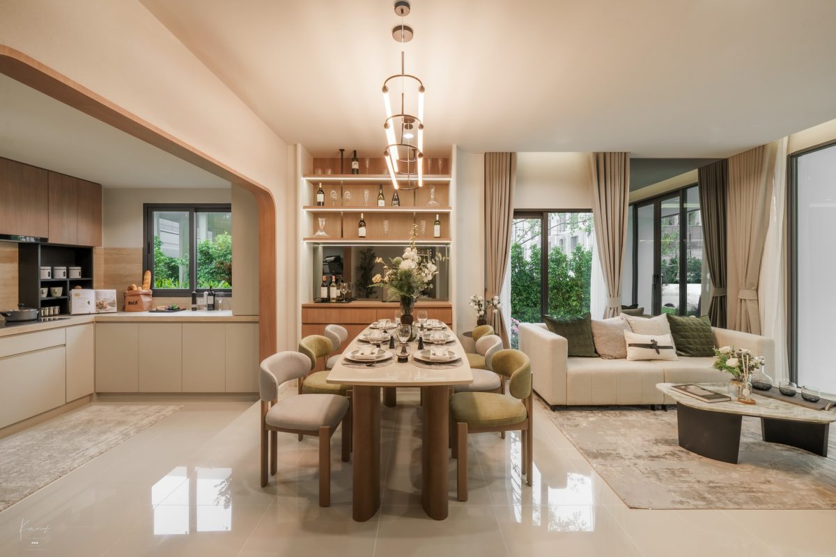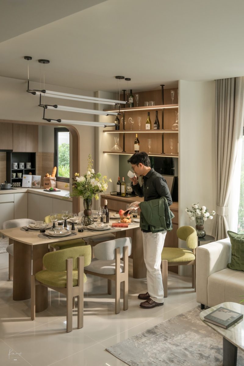 ถัดเข้าไปเป็น Dining Area ออกแบบให้มีเคาน์เตอร์บาร์ด้านข้างและจัดวางโต๊ะรับประทานอาหารรองรับได้ 6 ที่นั่ง นั่นคือสัญญาณว่าบ้านหลังนี้ถูกออกแบบมาให้ทุกคนมีมื้ออาหารร่วมกัน ไม่ว่าจะเป็นดินเนอร์กับครอบครัวหรือเอาไว้จัดปาร์ตี้เล็กๆ กับเพื่อนสนิทได้สบายๆ ครับ