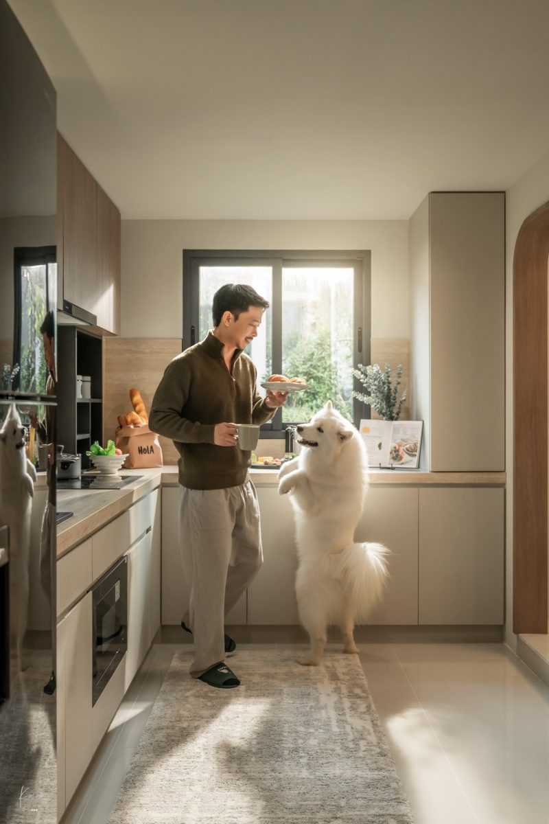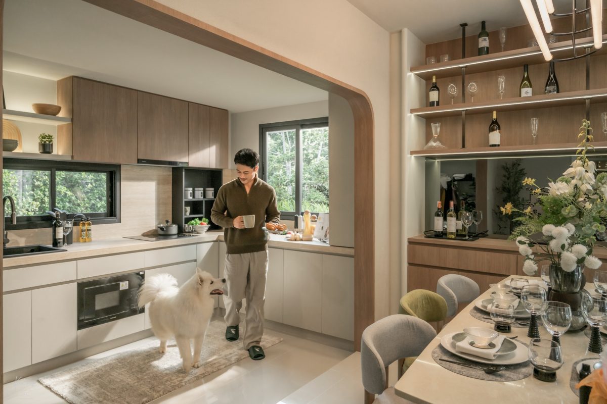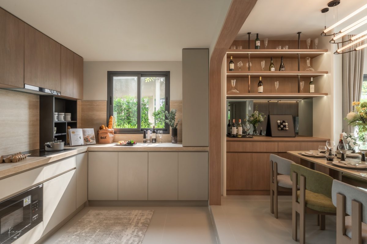 ส่วนพื้นที่ด้านหลังก็สามารถจัดการเป็นโซนแพนทรีหรือครัวที่ใช้งานได้จริง เป็นชั้นที่ออกแบบมาเพื่อการพักผ่อน นั่งจิบกาแฟยามเช้า หรือใช้เวลาแชร์เรื่องราวในแต่ละวันกับคนรักครับ