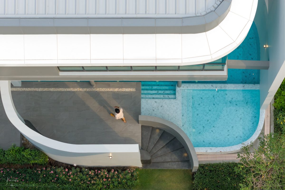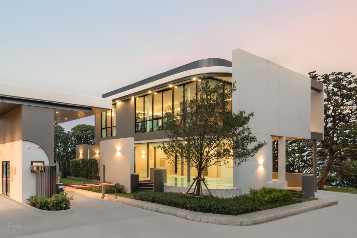 ภายนอกของ Clubhouse ออกแบบในสไตล์ Modern Minimalist ตัวอาคารเป็น 2 ชั้นโทนขาวครีมสะอาด มีผนังกระจกบานใหญ่ต่อเนื่องตลอดแนว ช่วยให้แสงธรรมชาติลอดเข้ามาได้ตลอดวันและยังทำให้มองจากฟิตเนสชั้นบนยังเห็นสระว่ายน้ำด้านล่างได้ด้วย งานดีไซน์เท่มากใช้เส้น Curve ที่ขอบหลังคาช่วยให้อาคารไม่แข็งกระด้างเกินไป ในช่วงเย็นที่แสงไฟภายในส่องออกมากับแสงพระอาทิตย์ตกที่ท้องฟ้ากระทบอาคารให้เปลี่ยนสี ทำให้ภาพรวมดูอบอุ่นในแบบพรีเมียม
