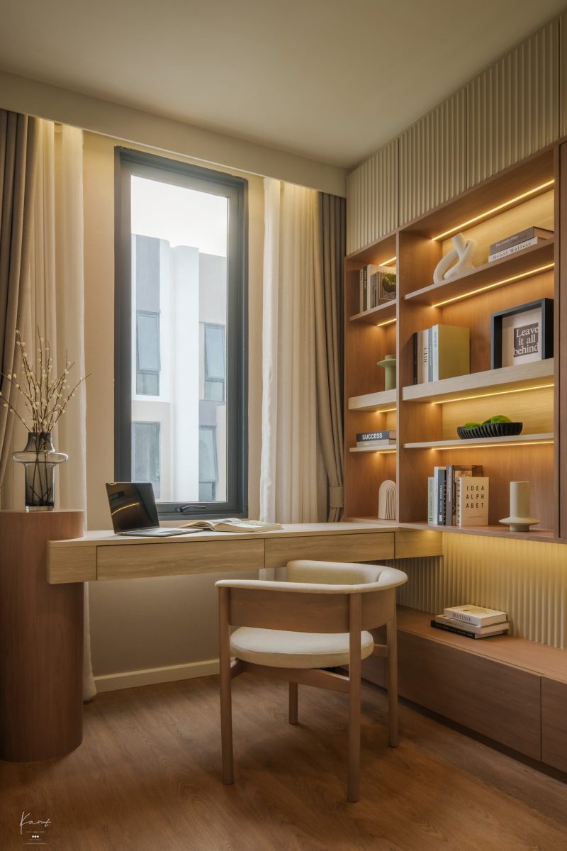 บ้านตัวอย่างทำเป็น Home Office/Study Room ที่มีชั้นวางหนังสือ Built-in ตลอดผนัง พร้อมโต๊ะไม้ติดหน้าต่างให้แสงธรรมชาติส่องเข้ามาตรงๆ ไม่ต้องเปิดไฟในตอนกลางวัน