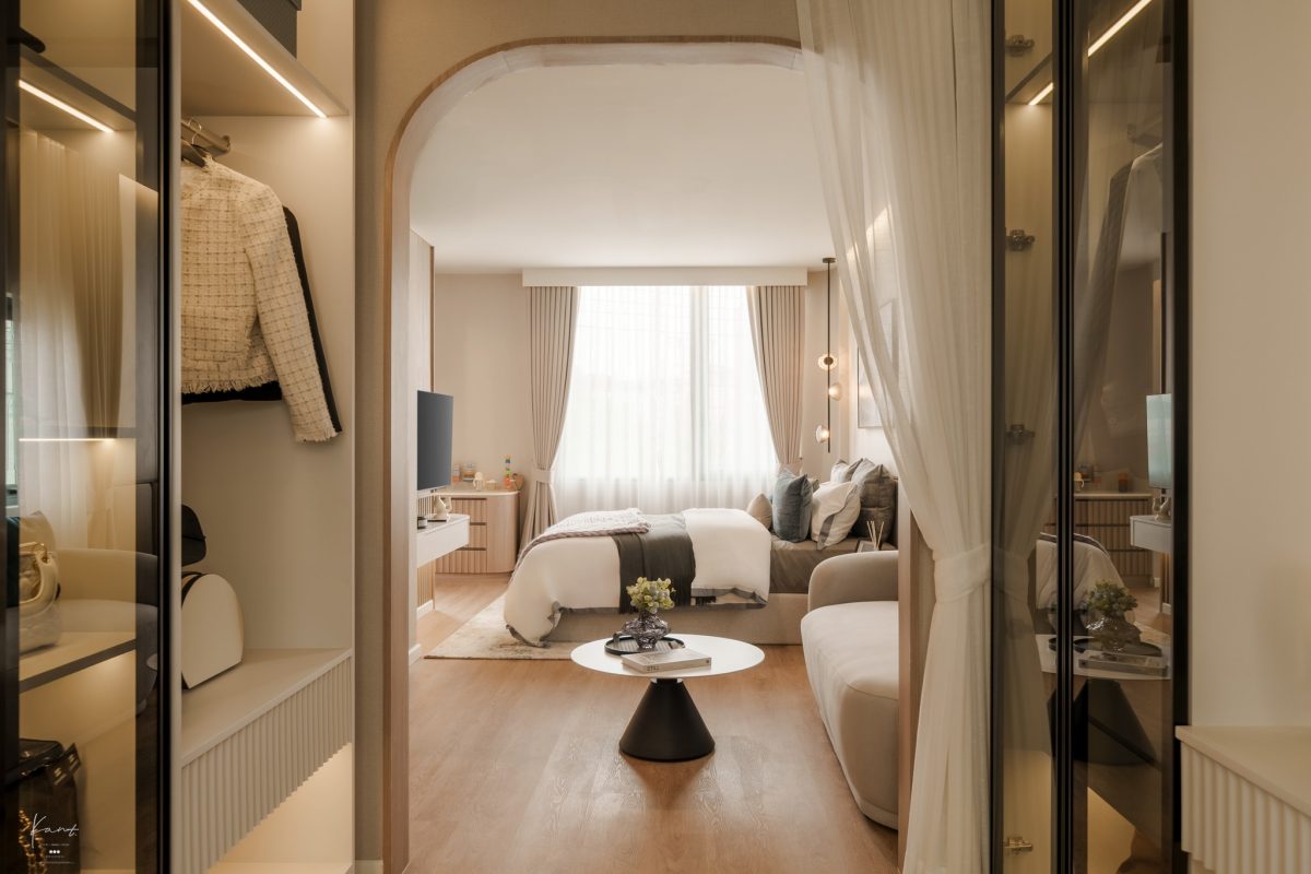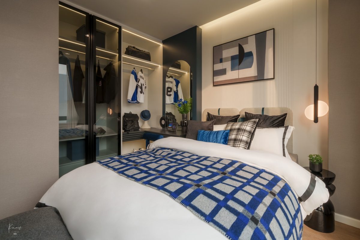 บ้านตัวอย่างตกแต่งภายในไว้เป็นไอเดียได้ดีมาก ภายในห้องแบ่งพื้นที่ออกเป็นสัดส่วนง่ายๆ จากด้านหน้าประตูจะเป็นมุมแต่งตัวด้วยตู้เสื้อผ้าบานใหญ่ที่จัดวางไว้ตรงกันข้ามกับห้องน้ำ