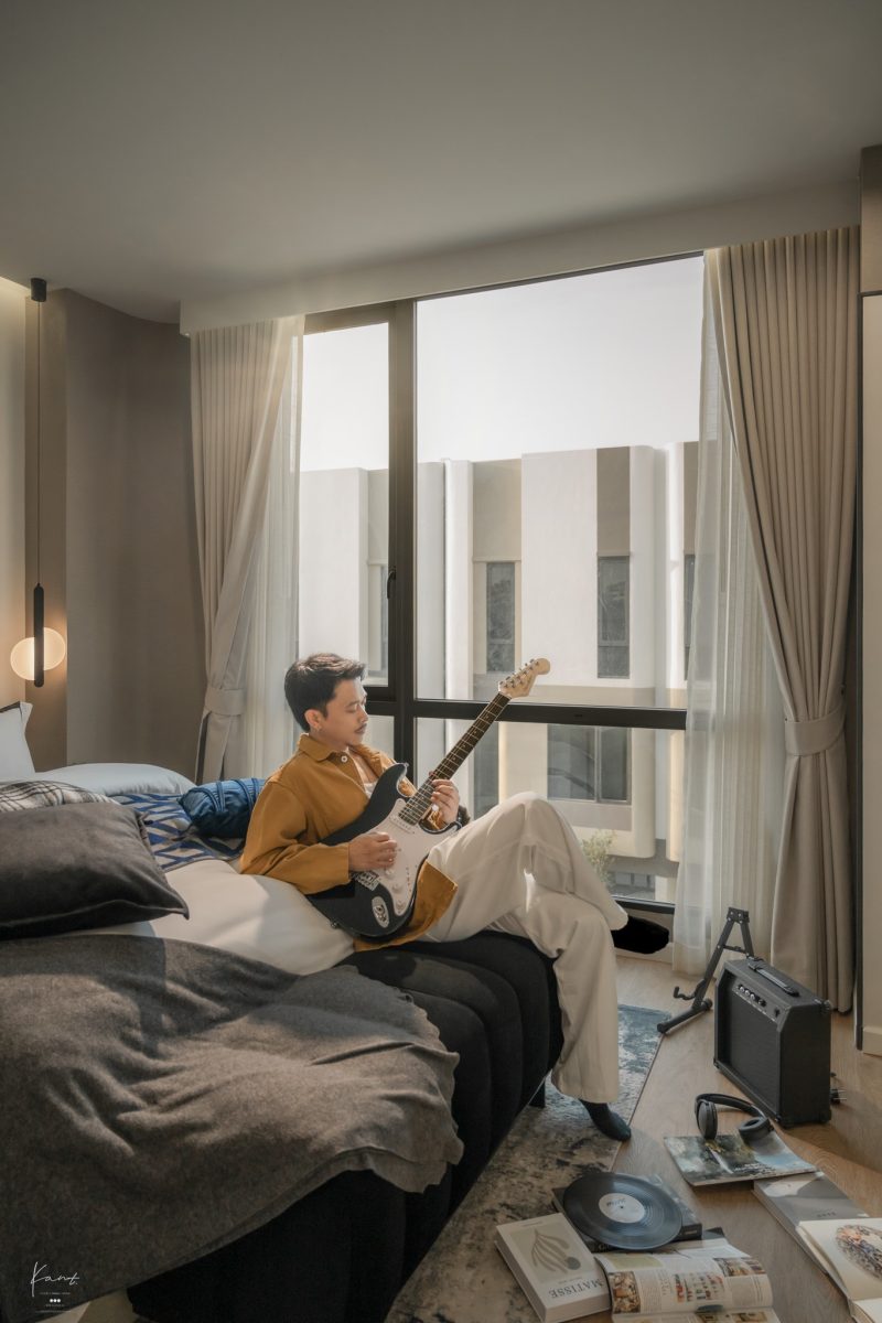 เริ่มจากห้องแรกมาแนวเท่ๆ เลยครับ นึกไปถึงห้องของชายหนุ่มที่หลงใหลในเสียงเพลงและงานดนตรี ตกแต่งด้วยโทนสีขาว ดำ น้ำเงินเข้ม ภายในห้องจัดแบ่งฟังก์ชันการใช้งานได้อย่างเป็นสัดส่วน ไม่ว่าจะเป็นพื้นที่พักผ่อน สามารถวางเตียงนอนขนาดควีนไซส์ได้สบายเลยครับ